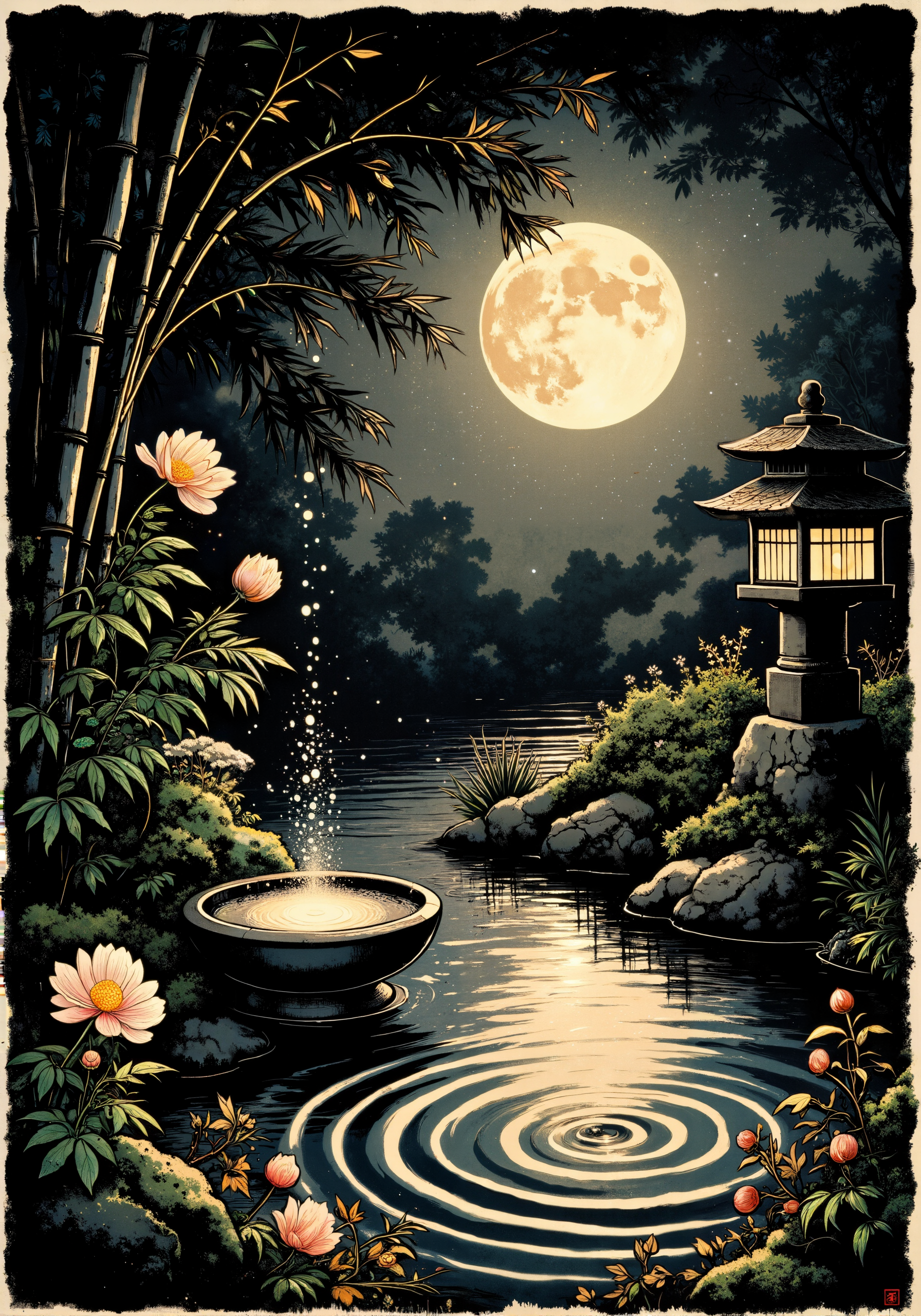 Serene sumi-e painting depicting a night garden illuminated by moonlight filtering through bamboo leaves, executed on aged washi paper with traditional charcoal ink. The composition embodies yugenâmysterious depthâwith subtle gradations of black and gray revealing ghostly peonies emerging from darkness. A solitary tsukubai water basin reflects the full moon, creating concentric ripples that symbolize the impermanence of being. Asymmetrical arrangement with negative space (ma) dominating the right portion, balanced by detailed rendering of moss-covered stone lanterns on the left. Delicate silver leaf accents suggest dewdrops on spider webs, invoking the Japanese aesthetic of mono no awareâthe pathos of transient beauty. The atmospheric scene captures the liminal moment between late autumn and early winter, when frost begins to claim the garden's edges. <lora:UkiyoFusion-FLUX:0.4> <lora:dreadmirth-art-style:0.6> <lora:FluxMythR3alisticF:0.1> <lora:Rainbow_on_black_style-000003:0.4> <lora:flux_dev:1>