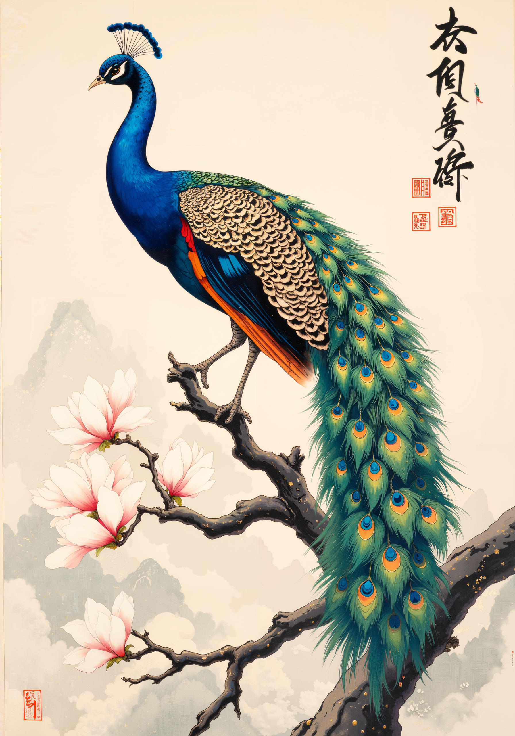 Traditional Chinese brush painting in meticulous gongbi style depicting a magnificent peacock perched on a gnarled magnolia branch in full bloom. The peacock's iridescent plumage rendered with mineral pigments of lapis blue, malachite green, and cinnabar red, displaying meticulous detail in each feather. White magnolia flowers with delicate pink edges contrast against dark ink branches, symbolizing feminine beauty and purity. Background features subtle gold-flecked rice paper with faint mountainous silhouettes in pale ink wash technique. Composition follows classical Song Dynasty bird-and-flower painting principles with harmonious asymmetrical balance. Elegant calligraphy in traditional script occupies the upper right corner, complemented by two vermilion seal stamps. Masterful brushwork demonstrates varying pressure techniques, capturing both the structural precision of the peacock and the ethereal softness of magnolia petals, embodying the Confucian ideal of refined beauty. <lora:RM_Animefy_v1.0M:0.6> <lora:ArtNouveau2Flux:0.5> <lora:FluxDFaeTasticDetails:0.2> <lora:flux_dev:1>