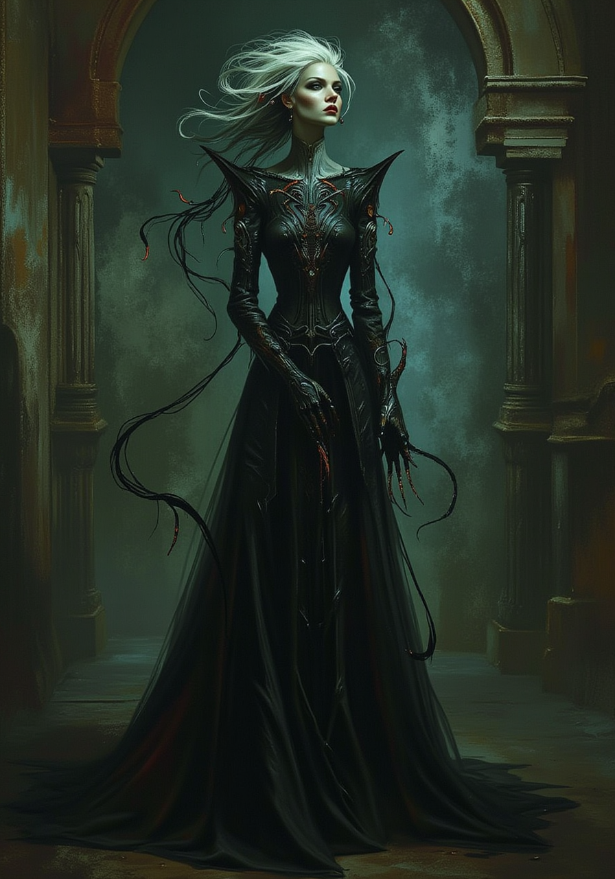 a high quality digital art of an eerie and captivating "opera diva" with intricate biomechanical elements inspired by the style of H. R. Giger. The diva is depicted with exaggerated features like a dramatic gown, elaborate hairstyle, and intense facial expressions. The background is a dark and futuristic setting reminiscent of Giger's iconic artworks, filled with industrial textures and mysterious lighting. The image is rich in details, showcasing a blend of organic and mechanical elements that create a sense of otherworldly beauty. The focus is on the diva's haunting presence, combining the elegance of opera with the surreal and macabre aesthetics of Giger's unique style. This digital artwork is high resolution, full of dark and alluring tones, and intricately crafted to capture the essence of both the opera world and the distinct visual language of H. R. Giger. style of H. R. Giger