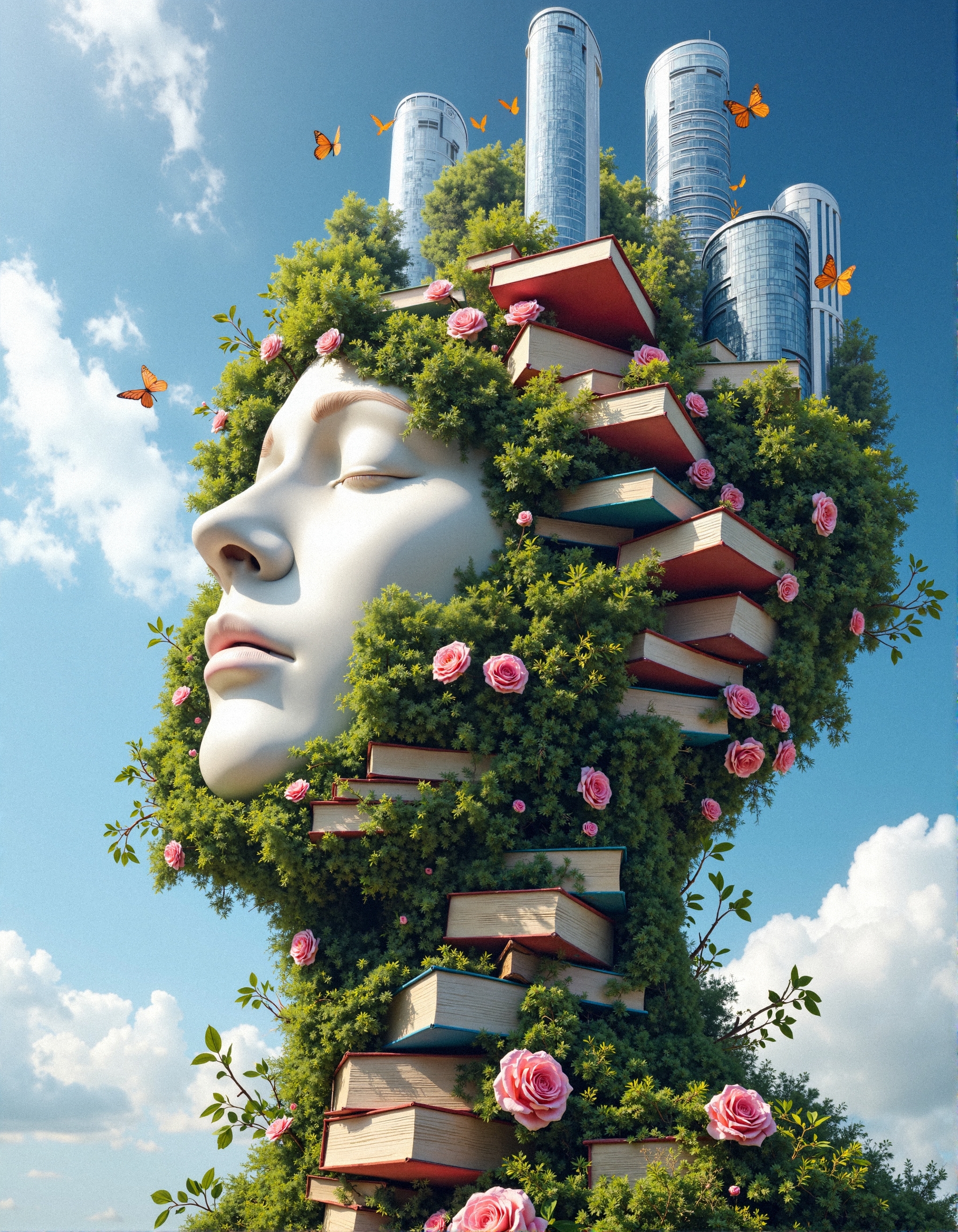 aidmaHyperrealism, A surreal conceptual artwork of a human head sculpted from books, glass skyscrapers, and lush greenery, symbolizing the profound connection between knowledge, nature, and urbanization. The face is serene and pale, emerging from a dreamlike fusion of stacked hardcover books, their spines vibrant in red, white, and beige, forming the structure of thought itself. Vines and wildflowers cascade from the pages, intertwining with the architecture of towering reflective buildings, their glass facades mirroring the vast blue sky with drifting white clouds. Tiny details like delicate butterflies rest upon blooming roses, while small birds nest among the foliage, embodying the harmony of intellect and organic life. The background is an open sky, creating an ethereal, limitless atmosphere, suggesting the infinite expansion of human knowledge and imagination. The composition is hyper-detailed, blending elements of surrealism, conceptual art, and dreamlike collage aesthetics, where philosophy, literature, and nature merge into a singular, breathtaking vision. <lora:aidmaHyperrealism-FLUX-v0.3:0.5> <lora:FluxDFaeTasticDetails:0.3>