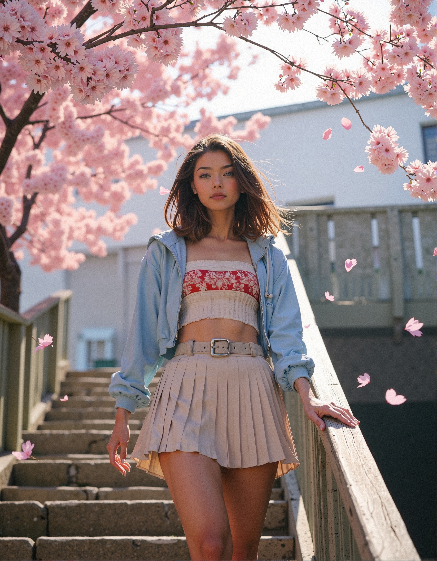 Hollywood Cinematic Film style, epic photography, dramatic light, Kodak film style, Aesthetics: Soft, pastel tones with a romantic touch. Camera: Full-body shot from below, showing the subject walking up the staircase with cherry blossoms surrounding her. Pose: The subject is walking up the steps, one hand resting on the railing, with a serene smile. Full Prompt: "A hyperrealistic full-body shot of a fashionable woman ascending a cherry blossom-lined stone staircase. She wears a light blue cropped hoodie, a belted pleated beige mini-skirt, and a textured tube top with a bold red print. Her pastel outfit contrasts beautifully with the vibrant pink blossoms above, as petals gently fall around her. The soft sunlight filters through the trees, illuminating the textures of her outfit and the smooth stone steps. Her expression is calm and elegant, with one hand lightly touching the wooden railing for balance, creating a serene and picturesque scene filled with subtle detail and harmony." <lora:Comic_Style_-_FLUX:0.75>