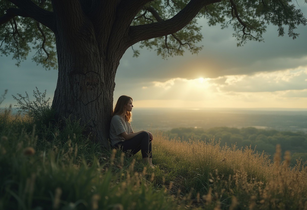 cinematography, realistic photograph, a sad beautiful woman sits next to a large tree on a hill in a vast meadow, she is crying and is looking out onto the distance. The tree has a small carving of a heart and initials, sun rays shining through storm clouds, on a gloomy day