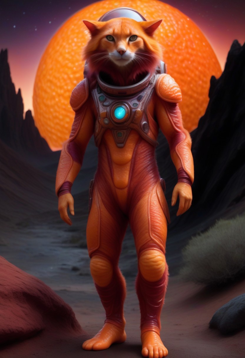 ((furry)), ((anthro alien explorer)), (detailed fur), (toeless footwear), (blood orange world morph), (cosmic landscape), (vivid nebula in blood orange and tangerine hues), (celestial elements), (sci-fi and fantasy fusion), (high detail), (mystical aura), (dynamic pose), (astronomy-inspired)
