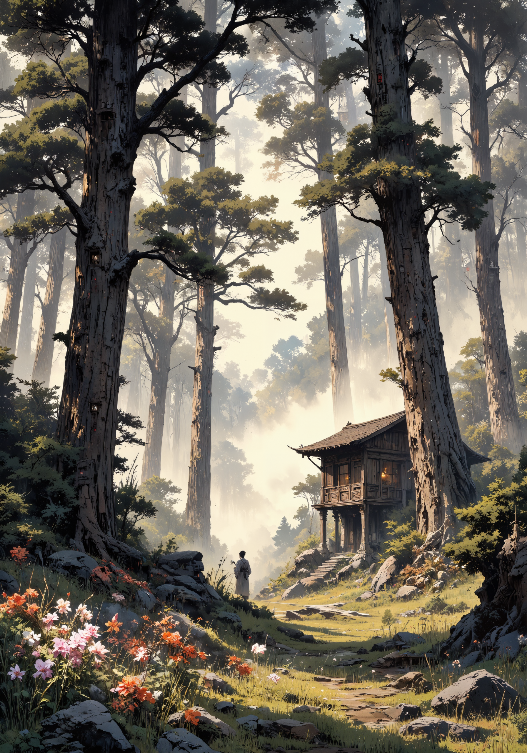 Ancient brushwork masterpiece of a tranquil forest clearing at dawn, rendered in traditional xieyi style with sparse, expressive ink strokes on aged rice paper. Towering pine trees frame the scene with bold vertical brushstrokes, their needles captured with light, feathery touches using the dry brush technique. Morning mist floats between tree trunks in translucent gray ink washes, embodying the qi energy that flows through nature. A small wooden hermitage nestles among wild orchids symbolizing noble character, with a tiny figure visible through the window practicing calligraphy. Light breaks through the canopy with strategic negative spaceâthe traditional 'leaving white' techniqueâcreating atmospheric perspective. Subtle mineral pigments of muted green, ochre, and pale blue accent the predominantly monochromatic composition. Executed with visible bamboo brush textures and spontaneous gesture capturing the spirit resonance (qiyun) of the scene. Balanced asymmetrical composition follows Song Dynasty aesthetic principles, conveying Taoist harmony through the interplay of substantial and insubstantial elements. Delicate chop seals in cinnabar red anchor the lower corner with classical scholarly elegance. <lora:Fluxartis 28.11A:0.7> <lora:New_Fantasy_CoreV4_FLUX:0.5> <lora:Niji B:0.4> <lora:MysticFantasy:0.6> <lora:flux_dev:1>