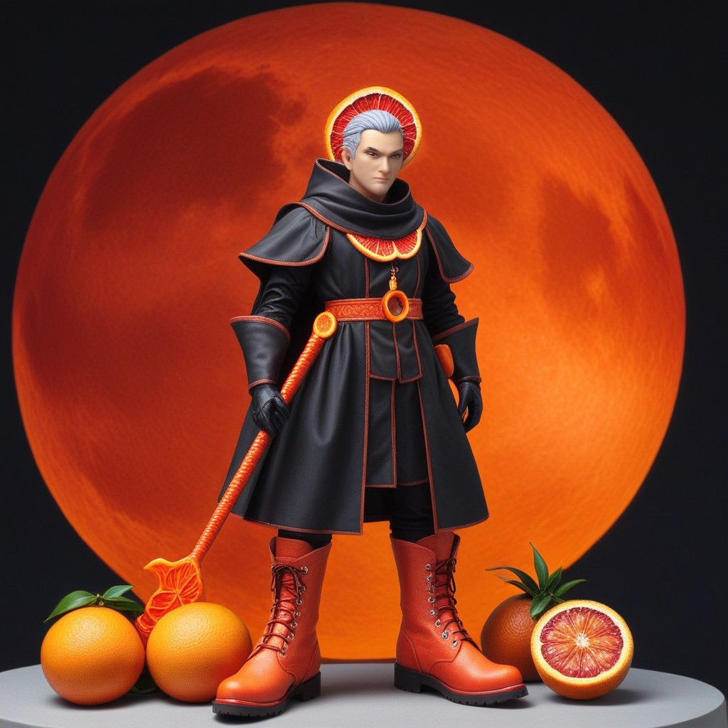 score_9, masterpiece, Close up, detailed, reflective, Dark Priest, prehensile tail, spade-tipped tail, pointy ears , blood orange staff, blood orange boots, overlooking a blood orange moon, and raised blood orange minions