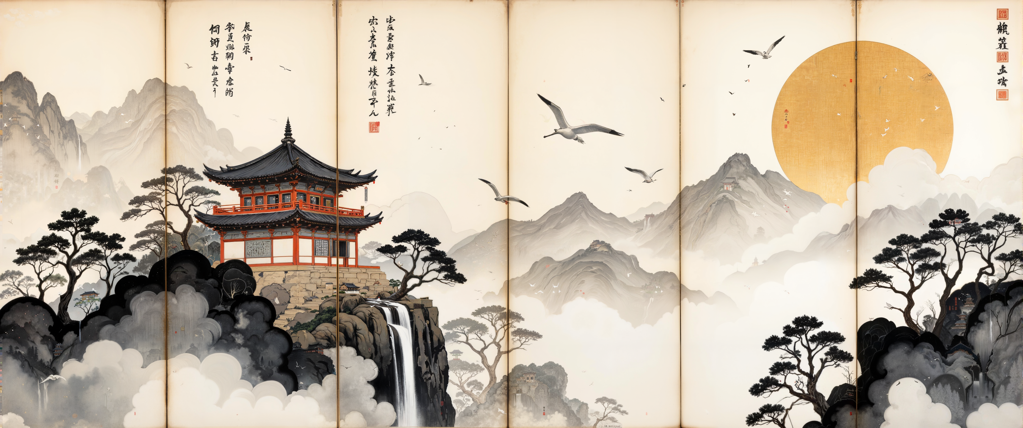 Traditional folding screen (byeongpung) depicting a serene Korean landscape in sumuk ink-wash technique, featuring misty mountains layered with pine trees and a cascading waterfall. Detailed hanok temple nestled among clouds, with vibrant dancheong-colored roof beams contrasting against the monochromatic backdrop. Delicate white cranes soar through spacious negative space, symbolizing longevity. Soft hanji paper texture with visible brush strokes and ink gradations from charcoal black to pale gray. Scattered red artist seals in corners, elegant calligraphy inscriptions expressing tranquility and harmony with nature. Golden sunset light filtering through mountains, creating atmospheric depth. Pine trees with precisely detailed needles, symbolizing steadfastness and perseverance. Masterpiece in traditional Joseon Dynasty technique with balanced composition following traditional Korean aesthetic principles of yeobaek (empty space) and jeong-jung-dong (dynamic stillness). Authentic representation of seonbi literati painting tradition with contemplative mood and spiritual resonance. <lora:FluxMythG0thicL1nes:0.4> <lora:Bonafida.Studio:0.2> <lora:ArtNouveau2Flux:0.2> <lora:DND_GRAINYBOYZ_FG_FLUX_V2_ROMULUS_Lora:0.1> <lora:Illustration concept Variant 3A:0.7> <lora:flux_dev:1>