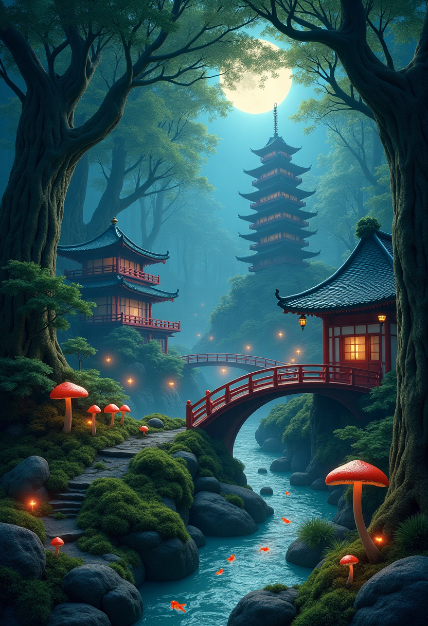 Create a surreal and breathtaking landscape inspired by the fantastical world of Spirited Away. Envision a dense, ancient forest where gnarled trees stretch toward the sky, their branches intertwining like veins. Moss-covered stones jut out from the earth, adorned with delicate ferns and luminescent mushrooms. A narrow, winding path leads deeper into the woods, flanked by whispering streams that glisten in the moonlight. Mist hovers above the ground, giving the scene an eerie yet calming aura. In the background, traditional Japanese architecture emerges from the fog—tall pagodas with curved roofs and lanterns hanging from their eaves. The buildings seem to blend seamlessly with nature, as if they’ve grown from the very soil itself. Vibrant red bridges span over small ponds filled with koi fish, their scales glimmering beneath the surface. Fireflies dance around the area, adding flecks of gold to the nighttime canvas. The overall mood is one of enchantment and tranquility, a place where reality and fantasy converge in perfect harmony.