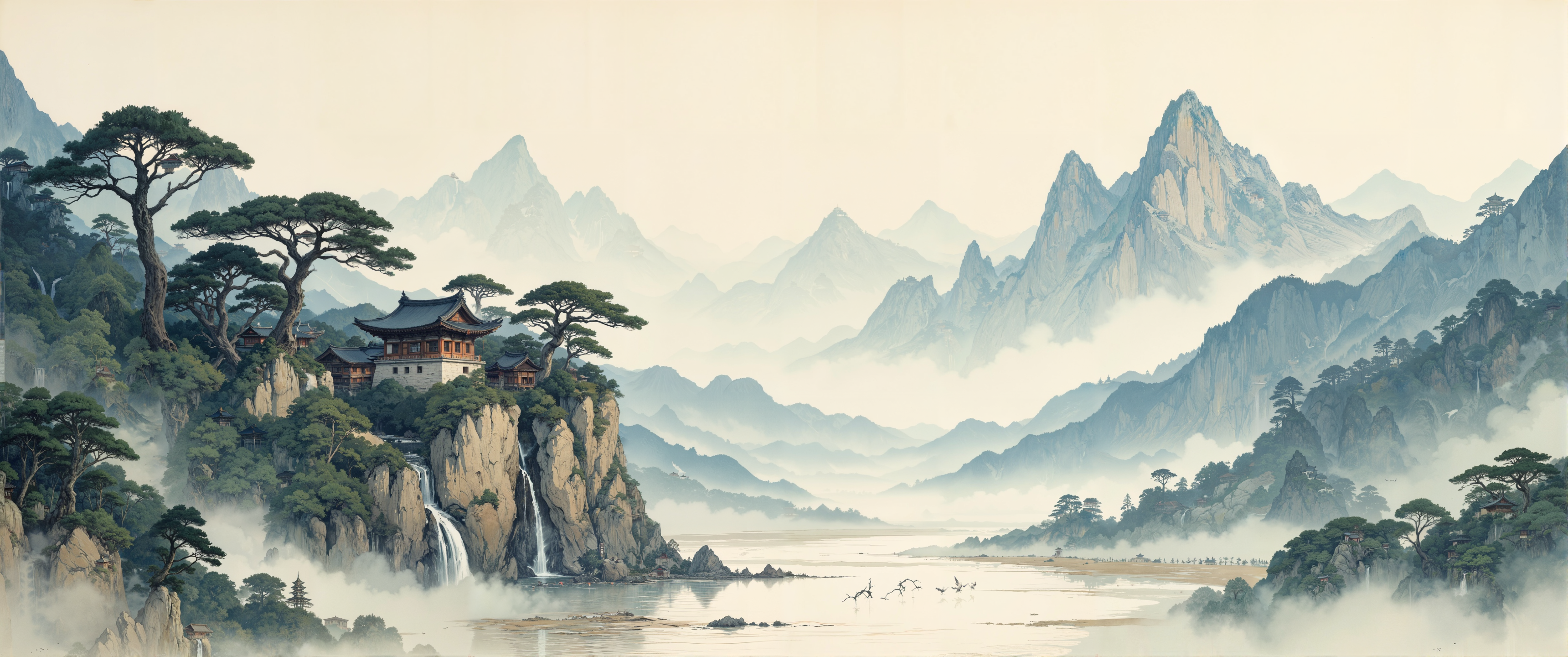 Hanji horizon: misty Korean mountainscape rendered on textured traditional mulberry paper, delicate layers of sumuk ink wash technique creating ethereal gradients. Ancient pines cling to craggy peaks, their gnarled forms silhouetted against morning fog. Buddhist temple roof peaks emerge from mist valleys, dancheong colors barely visible. A small hanok nestled on mountainside with wisps of cooking smoke rising. Distant waterfall cascades down rock face, rendered with minimal brushstrokes. Red-crowned cranes wade through misty wetlands below. Obangsaek color palette of subtle blues, greens, and earthy tones. Negative space dominates composition, embodying yeobaek aesthetic. Delicate calligraphy in one corner with artist's seal stamp. Masterpiece capturing Korean jeong sensibility, contemplative mountain spirits, photorealistic yet dreamlike, evocative. <lora:FluxMythG0thicL1nes:0.4> <lora:zyd232_Ink_Style_Flux1D_v1_1:0.1> <lora:ck-shadow-circuit-000021:0.2> <lora:MoriiMee_Gothic_Niji_Style_FLUX:0.4> <lora:Illustration_Style_IV:0.4> <lora:flux_dev:1>