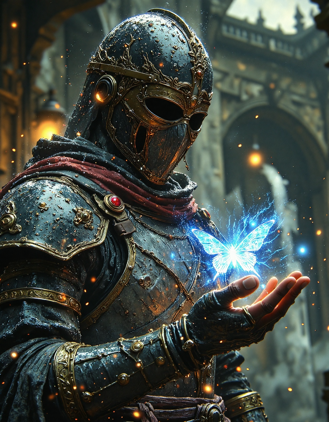 moody digital painting in a dark fantasy style, heavily emphasizing atmospheric rain. Picture a knight in full plate armor, helmet obscuring their face, standing in a rain-soaked environment. The knight's armor is dark metal and appears to be weathered and wet. They are holding out a hand, and resting on their fingertips is a glowing, bright blue butterfly. The background is blurred but suggests dark, rocky cliffs and more rain falling. The scene is lit softly, with the butterfly being the primary light source, contrasting against the dark, rainy setting. The overall mood is melancholic yet hopeful, with a strong focus on the contrast between the knightâs harshness and the butterflyâs fragility, <lora:Vibrantly_Dark_style_v.1:0.5>, <lora:anhei_first_flux_lora_v1:0.4>, <lora:FantasyWizardWitchesFluxV2-000001:0.8>, <lora:aidmaMJ6.1_v0.5_3:0.6>