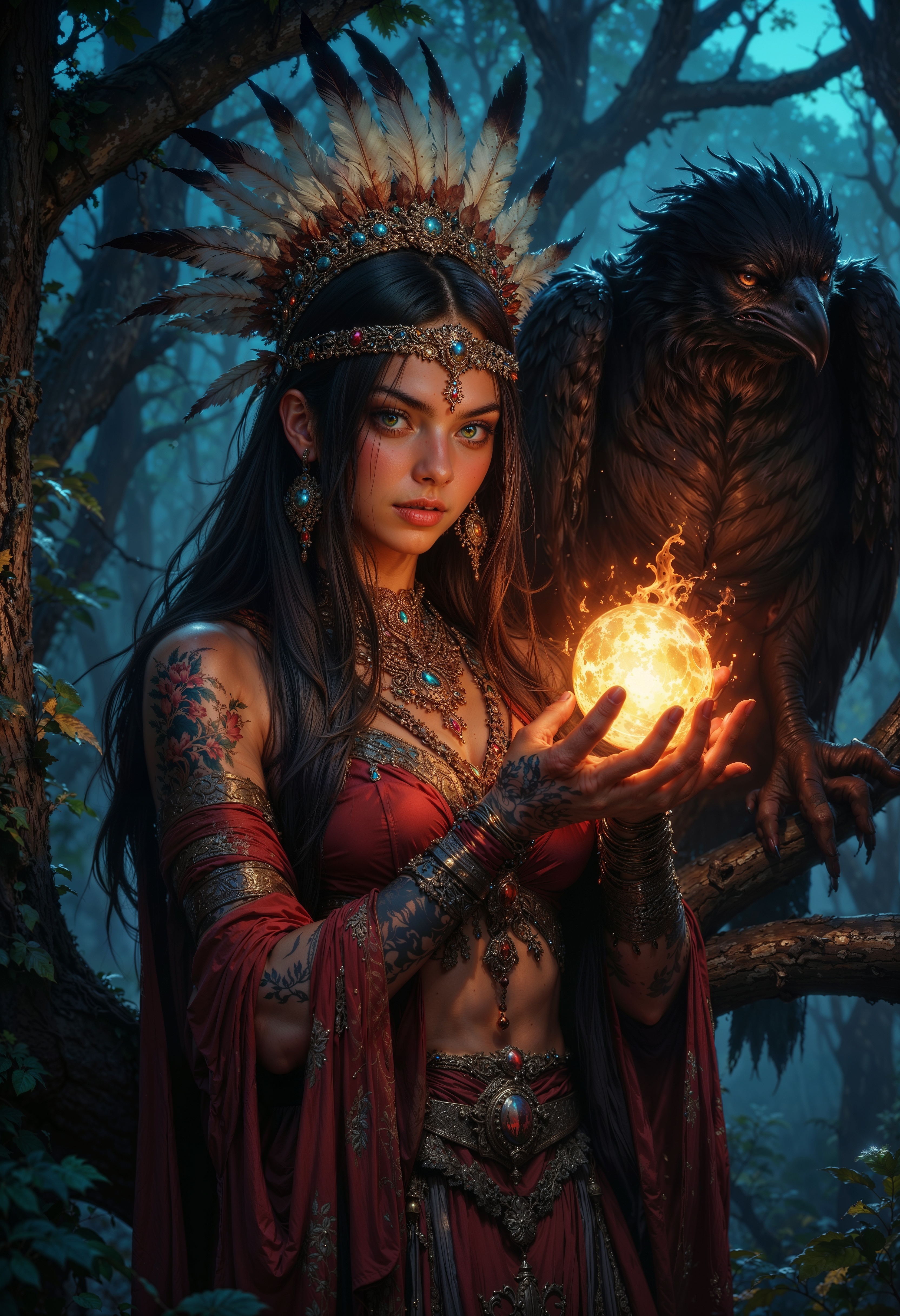 a mystical scene set in a dimly lit forest. The central subject is a Native American woman with long, flowing dark hair adorned with an elaborate headdress made of feathers. Her skin is a warm tone, and her facial features are striking, with glowing eyes that match the fiery orb she holds in her hands. She wears intricate jewelry and tribal-inspired clothing with detailed patterns. Her arms are decorated with tattoos, adding to her enigmatic appearance. Beside her, perched on her arm, is a large, dark-feathered bird with piercing eyes, contributing to the mystical atmosphere. The background is a dense forest with a bluish hue, enhancing the magical and mysterious ambiance of the scene.