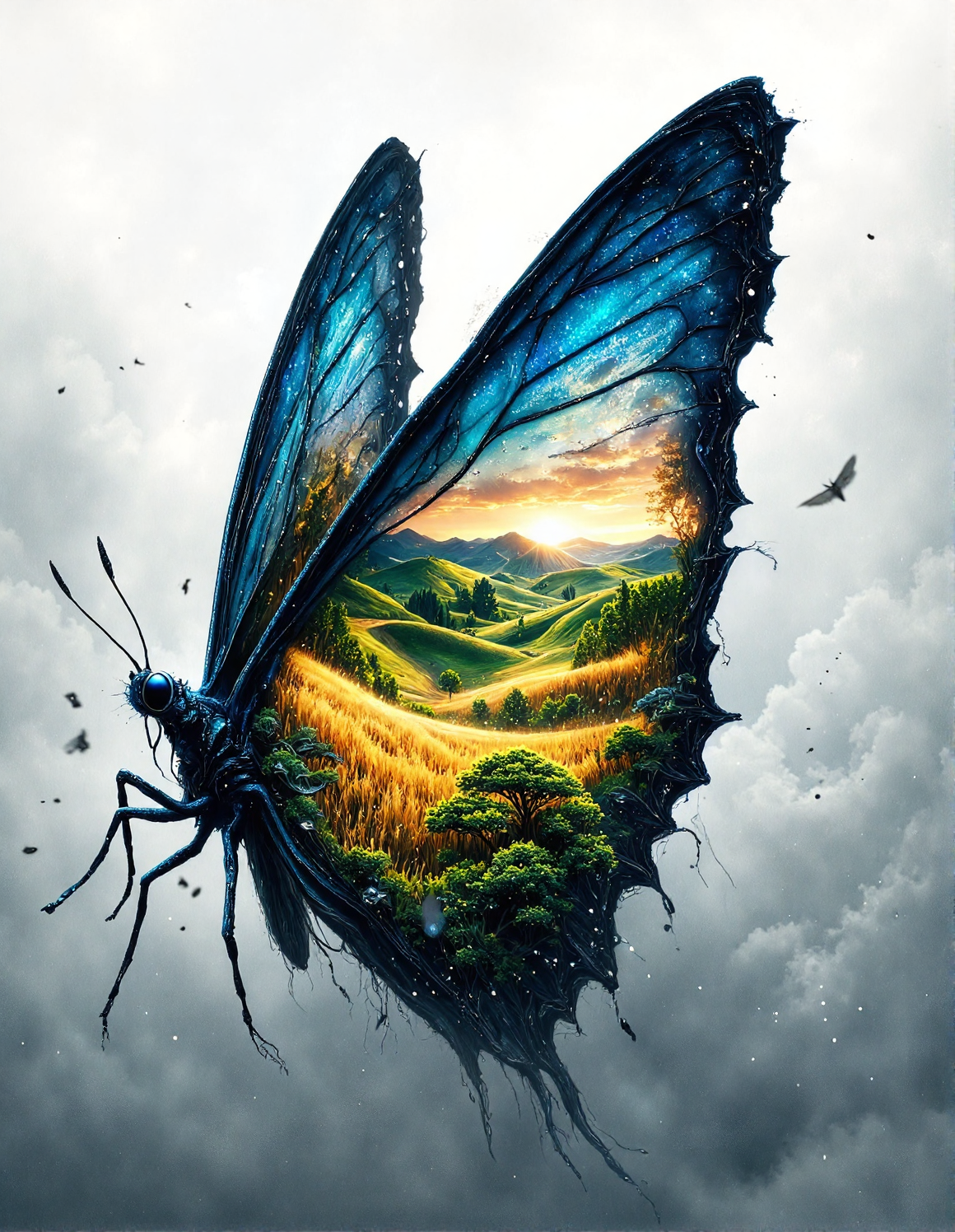 whimsical, illustrative digital painting of a butterfly with a landscape scene contained within its wings. The butterfly is depicted in profile, with its large, detailed wing filling most of the frame. The wing is divided into two distinct sections: the upper section features a sky gradient blending from blue to warm gold at the top, suggesting sunset or sunrise, while the lower section displays a lush green landscape with rolling hills, fields of golden grass, and scattered trees. The butterfly's body is rendered in shades of dark grey and black, with delicate legs and antennae. The edges of the wings are outlined in a darker tone, enhancing their shape. The background is a soft, misty gradient of light greys and whites, giving a dreamy, ethereal feel. Capture the image in a soft, painterly style, emphasizing the blend of nature and fantasy, <lora:FantasyWizardWitchesFluxV2-000001:0.8>, <lora:Dever_Flux_Enhancer:0.4>, <lora:fluxenhancer:0.4>, <lora:FluxMythR3alisticF:0.6>