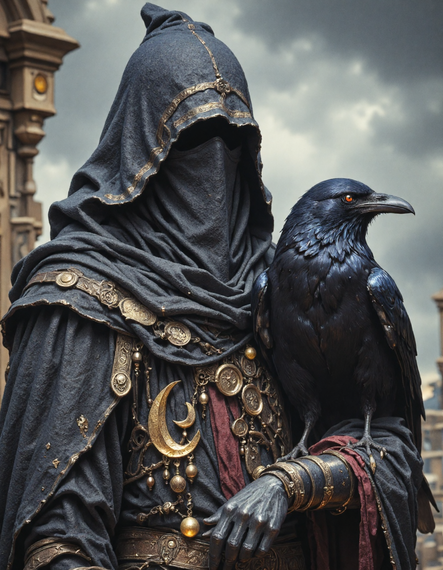 A close-up portrait of a mysterious figure cloaked in heavy, dark, textured clothing. The figure is mostly obscured by a large hood and a detailed veil that covers the lower part of their face. The clothing made of rough, dark fabrics with hints of gold and brass pendants and a crescent moon charm. Perched on the figure's arm is a large, detailed black raven with sharp eyes and textured feathers. The background is softly blurred, an outdoor, overcast environment with muted colors. The art style is realistic digital painting with a focus on texture and somber, muted colors. The overall mood is mysterious and slightly melancholic, <lora:aidmaIllustriousv0.2:0.7>, <lora:RetroAnimeFluxV1:0.5>, <lora:FantasyWizardWitchesFluxV2-000001:0.5>, <lora:FluxMythR3alisticF:0.5>