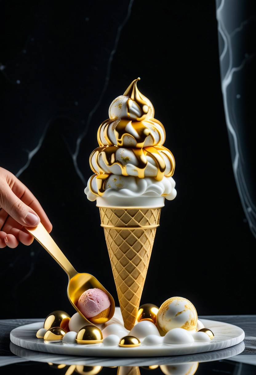 8K analog photo, Diorama page, Hand held an ice cream, close up, ice cream made of Liquid Marble and gold, dark background, minimalist,