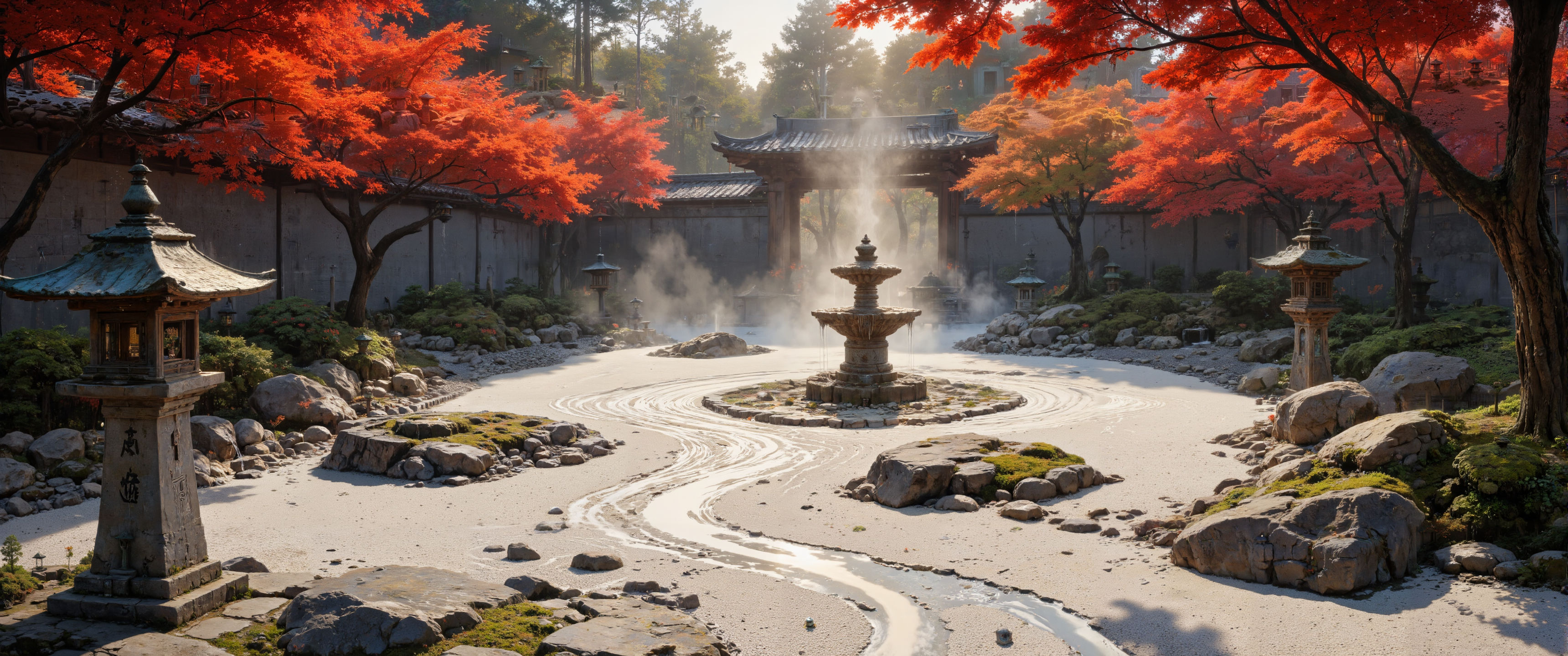 Traditional Japanese zen garden masterpiece in nihonga style, featuring meticulously raked white gravel patterns resembling flowing water around moss-covered islands. Ancient stone lanterns with verdigris patina cast long shadows across the peaceful composition. Weathered maple trees with vibrant crimson leaves provide seasonal accent against charcoal-gray temple walls. Bamboo water fountain with rhythmic hollow sound breaks serene silence. Carefully placed stepping stones create mindful pathway through contemplative space. Morning light filters through delicate mist, creating ethereal atmosphere with soft golden illumination. Subtle wabi-sabi aesthetic evident in perfectly imperfect stone arrangements. Minimalist composition emphasizing ma (negative space) with balanced asymmetry. Textured handmade washi paper quality. Subdued color palette of earthy ochres, gentle greens, and muted grays. Intricate details rendered with traditional mineral pigments. <lora:zy_horror_monsters_flux:0.7> <lora:aidmaMJ6.1-FLUX-v0.4:0.4> <lora:RM_Animefy_v1.0M:0.5> <lora:Anime realistic V2:0.4> <lora:artilands:0.5> <lora:flux_dev:1>