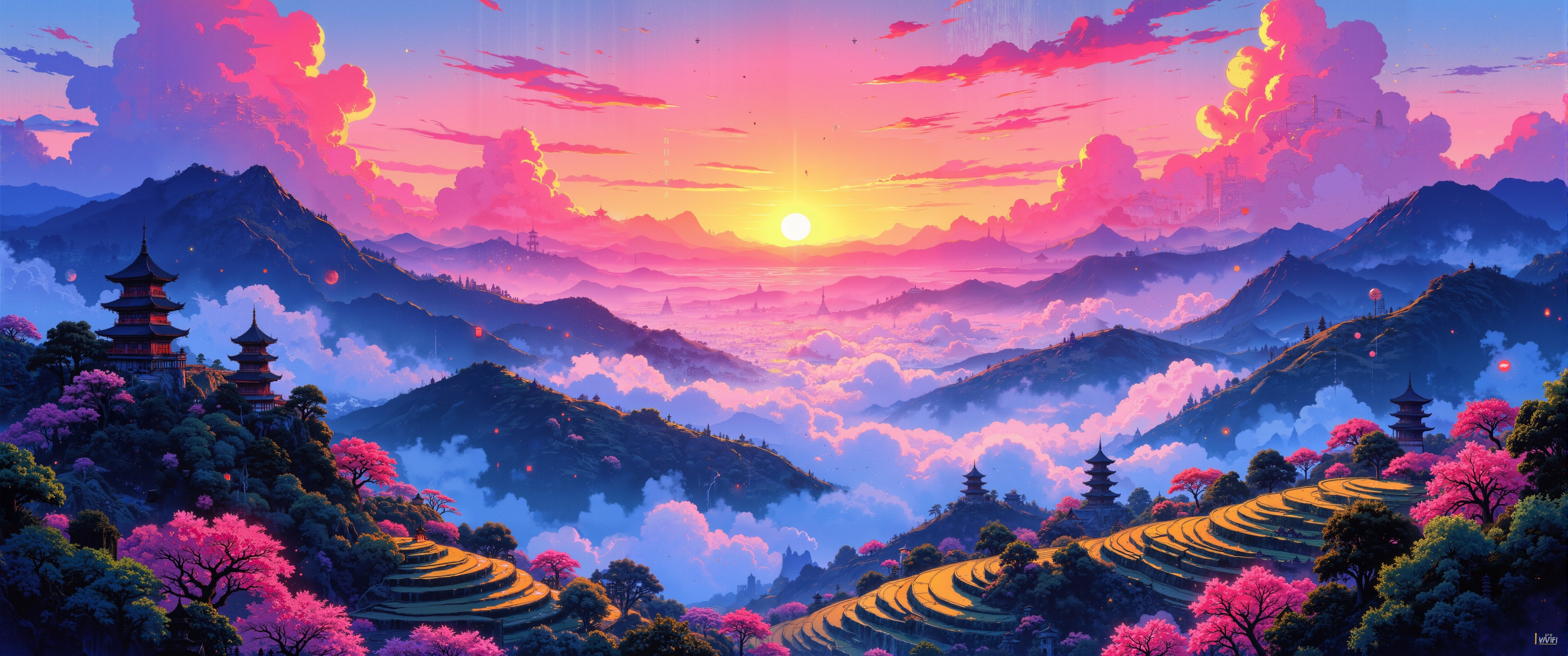 A breathtaking watercolor mountainside sunset where vibrant magenta and amber hues bleed into cerulean skies. Silhouetted pagodas and cherry blossom trees dot the mid-ground against dramatic cumulus formations tinged with gold. The atmosphere is thick with luminous particles, creating a misty ethereal quality that softens edges. Rice terraces cascade down the foreground slopes, their water-filled surfaces perfectly mirroring the spectral light display above. Traditional ink-wash technique blends with contemporary color theory, capturing that magical blue hour transition. Distant temple bells seem to echo across the valley as lanterns begin to glow. 8K ultra-detailed brushwork reveals intricate cloud textures and light diffraction patterns through moisture-laden air, evoking profound serenity and contemplative wonder. <lora:sxz-Dark-Fantasy-v2-Flux:0.3> <lora:CPA:0.3> <lora:Classic_Anime_Colors:0.5> <lora:flux_dev:1>