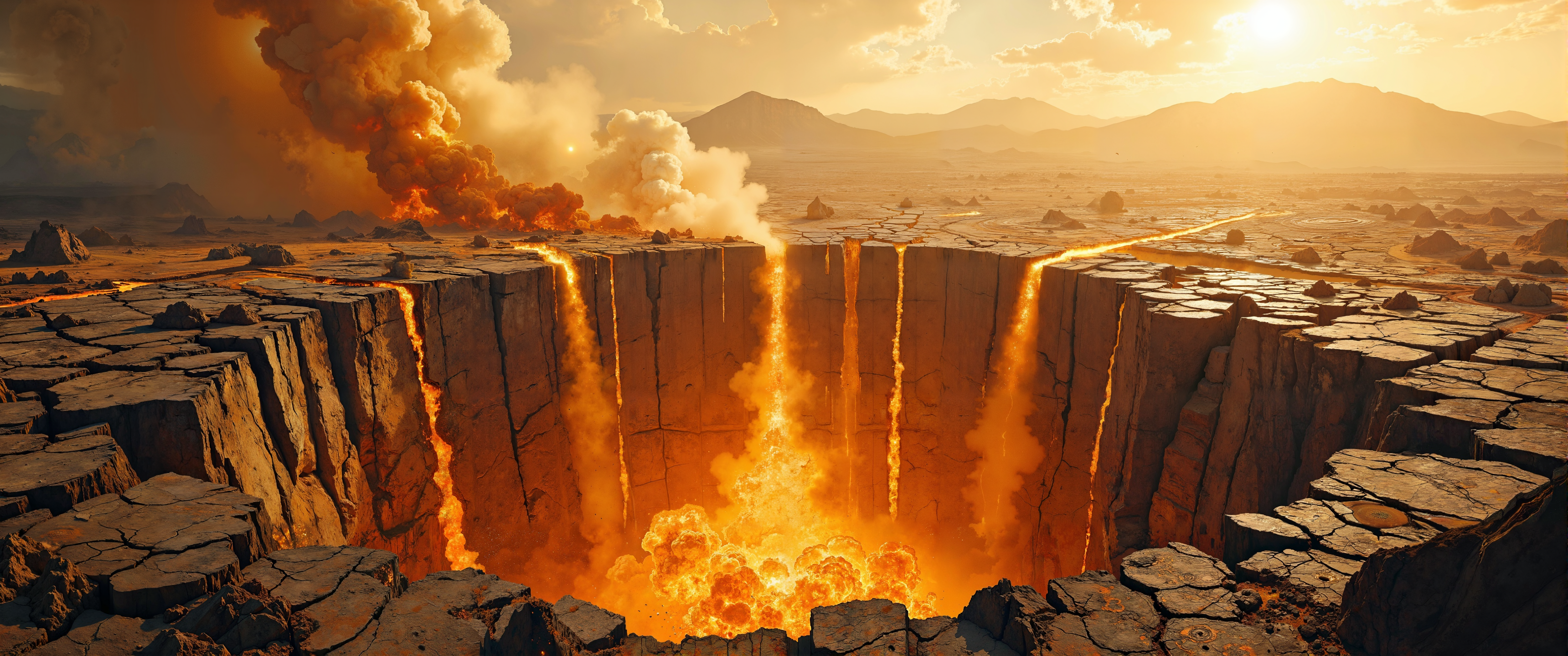A catastrophic earthquake fracturing the landscape, colossal fissures splitting ancient bedrock as tectonic energy ripples through layered earth strata. Crystalline geodes and molten magma exposed beneath the surface glow with otherworldly intensity. Massive dust clouds billow upward, illuminated by golden sunlight piercing through the chaos. Shattered earth fragments suspended mid-air in the moment of destruction, defying gravity. Mountains in the distance warp and buckle under tremendous pressure. The fractured terrain reveals a stunning geologic palette - rusty reds, amber ochres, slate blues and obsidian blacks in intricate patterns. Hypnotic ripple effects emanate from the epicenter, creating concentric circles of destruction across the tortured landscape. Photorealistic textures of pulverized stone, dirt, and minerals catching dramatic lighting. Ultra-detailed 8K resolution capturing every fragment and dust particle. Cinematic wide-angle composition emphasizing the overwhelming scale and raw elemental power. Masterpiece quality with extraordinary depth, dramatic shadows and hyperrealistic rendering. <lora:Illustration concept V1:0.6> <lora:Chris_Luka:0.2> <lora:flux_dev:1>