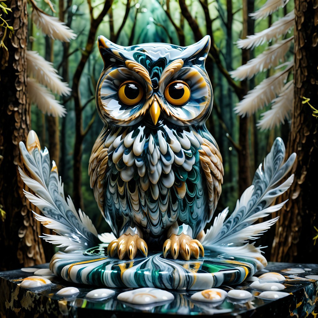 score_9, score_8_up, score_7_up, score_6_up, score_5_up, score_4_up score_9,score_8_up, a realistic owl made of Liquid Marble with liquid marble feathers on a forest background made of Liquid Marble, wearing an cat shaped cap