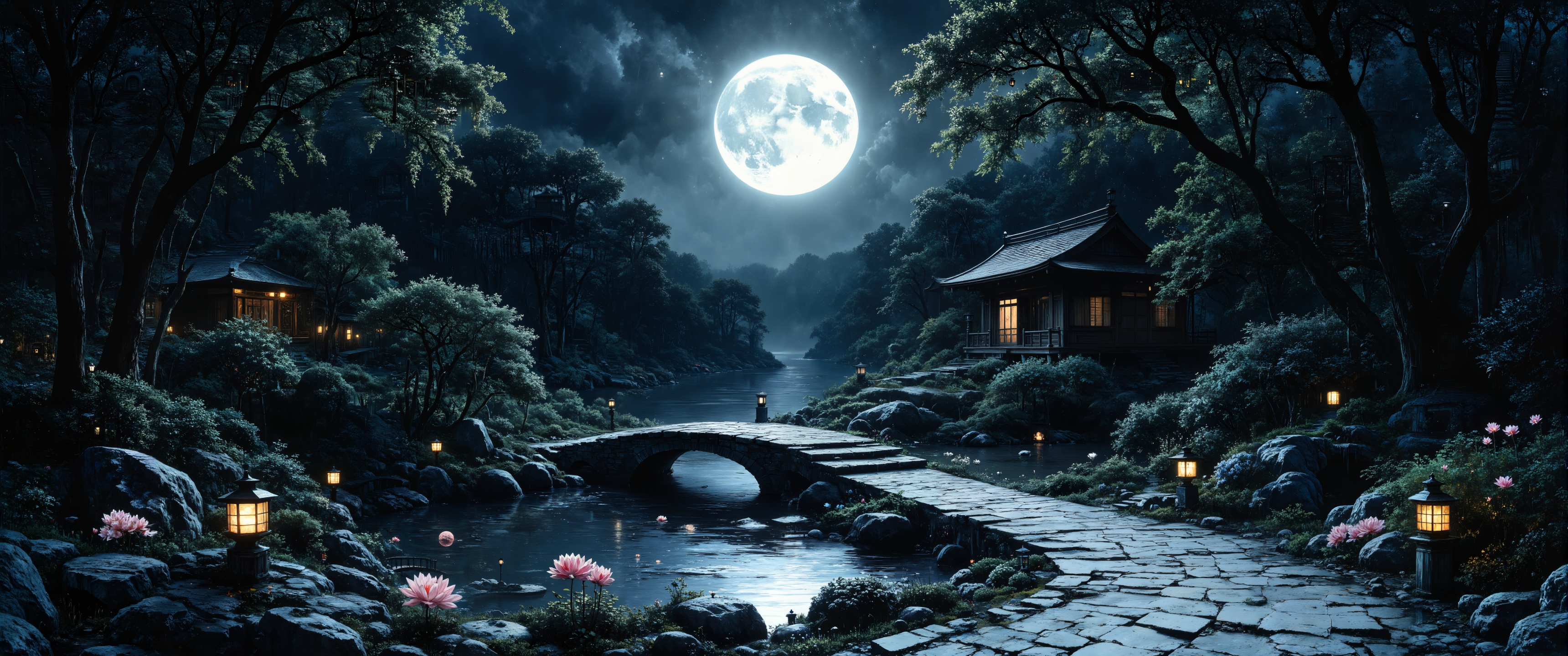 Ethereal moonlit Japanese garden featuring a winding pebble path leading to a secluded tea house nestled among ancient maples. Stone lanterns illuminate the way, casting soft shadows across meticulously raked white gravel patterns symbolizing flowing water. A wooden arched bridge spans a still koi pond reflecting the full moon's silvery light. Moss-covered stones and carefully trimmed azalea bushes create layers of texture. Rendered in dreamy nihonga style with traditional mineral pigments on washi paper, emphasizing yugenâthe profound mystery of beauty. Masterful composition balances negative space (ma) with delicate summer foliage and night-blooming lotus flowers. Cool palette of indigo, silver, and deep forest greens with subtle touches of moonlit blue. Weathered bamboo fences frame the scene, embodying wabi-sabi aesthetic of imperfect beauty and the passage of time. <lora:New_Fantasy_CoreV4_FLUX:0.7> <lora:ç»ªå¿ CG飿»¤éFLUX:0.6> <lora:Mezzotint_Artstyle_for_Flux_-_by_Ethanar:0.5> <lora:flux_dev:1>