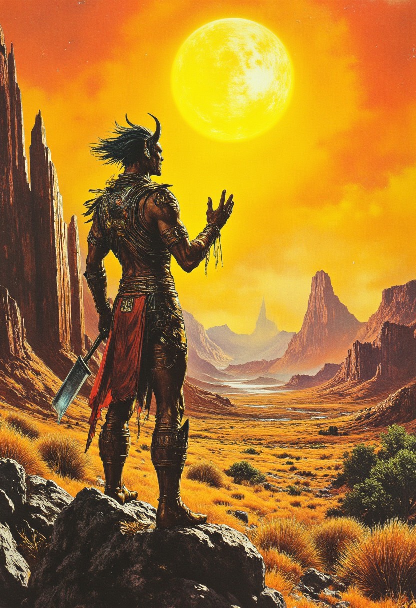 80s vintage pulp sci-fi magazine cover of A Tauren Sunwalker, mace in hand, praying to the sun amidst the rolling plains of Mulgore, a serene and powerful presence against the vast landscape., in the style of a frank frazetta oil painting mixed with world of warcraft