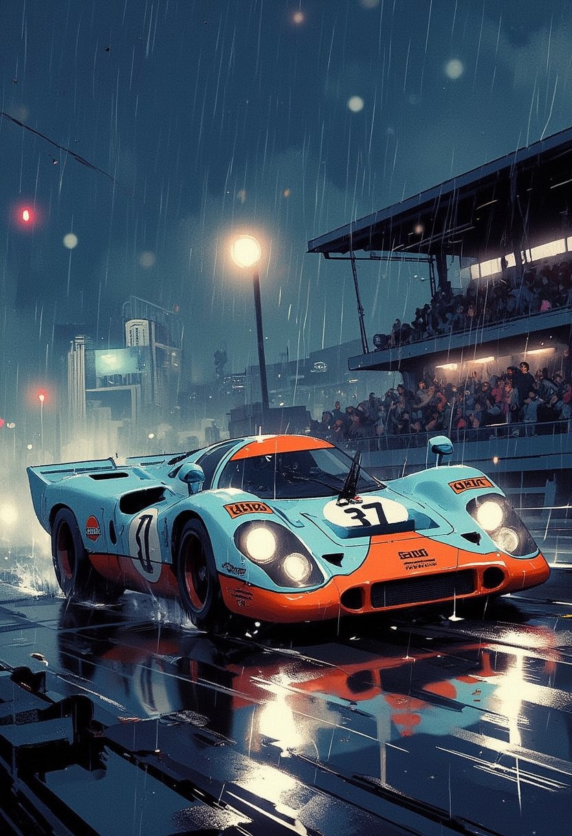 nvinkpunk, Special Ink-drawing mode, Mh1$AgThS2, intricate linework with expressive contrasts, a Porsche 917K, number 37, racing at night in the rain at Le Mans, powder blue and orange Gulf livery, spray, bokeh