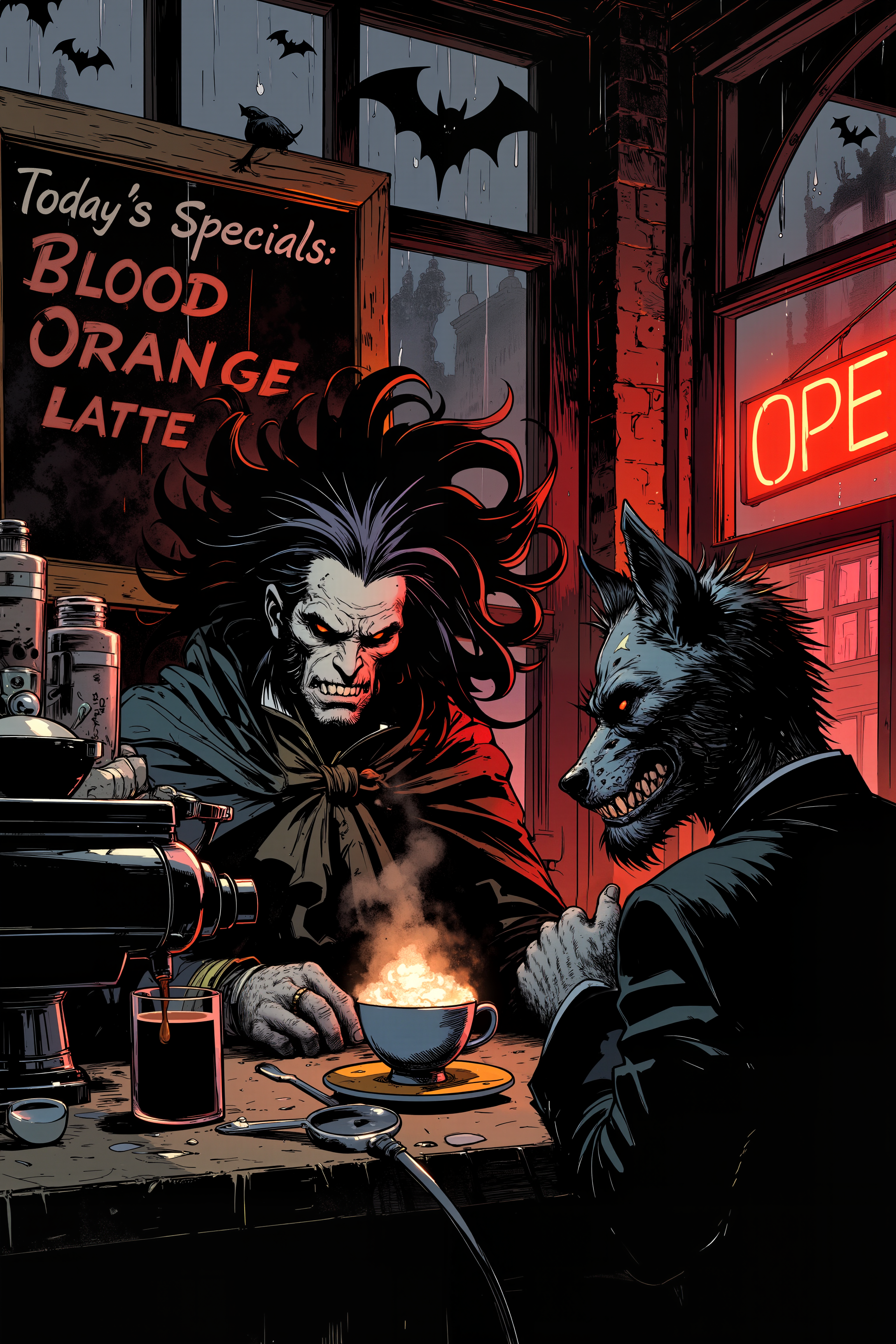 Inside a dimly lit, gothic coffee shop, a pale, brooding vampire with long flowing hair and a tattered cloak leans over a steaming espresso machine, his glowing red eyes filled with existential despair. The chalkboard behind him reads "Todayâs Special: BLOOD ORANGE LATTE," scrawled in elaborate, eerie handwriting. A single bat perches lazily on the tip jar, while a customerâa werewolf in a business suitâimpatiently checks his watch, waiting for his order. Rain streaks the large windows, the glow of a flickering neon âOPENâ sign casting long shadows across the room, while the vampire sighs dramatically, pouring a perfectly crafted latte with an intricate skull-shaped foam design.<lora:Ev_Ganin:0.4><lora:Vintage comic book:0.4><lora:RetroAnimeFluxV1:0.15><lora:Greg_Capullo_style:0.4><lora:jeanClaude_Mzires_Style_FLUX-000001:0.4><lora:Flux_Ink_Anime:0.4>