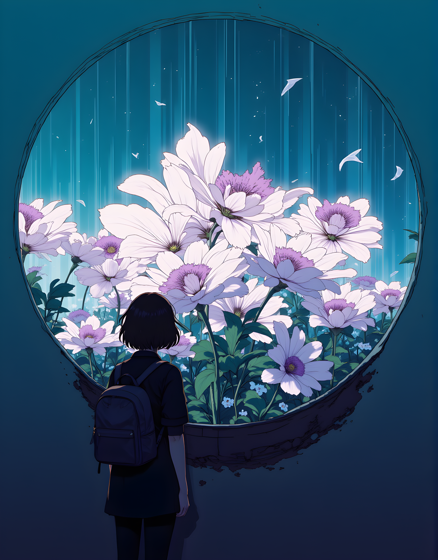 an artistic illustration of a person with short dark hair standing in front of a large circular window or portal the window is filled with an ethereal scene of oversized white and purple flowers with intricate petals and green foliage the background behind the flowers appears to be a glowing blue light giving the scene a dreamy and otherworldly atmosphere the person is wearing a black outfit and has a backpack on their shoulders they are facing away from the viewer looking into the window the overall color palette is dominated by shades of blue and purple creating a serene and mystical mood j_art, anime, anime art, <lora:FLUX\jul\J_Anime:1.0>, <lora:FLUX\Anime Art V3:0.1>, <lora:FLUX\RM_Artistify_v1.0M:0.1>, <lora:FLUX\RetroAnimeS1.1:0.1>