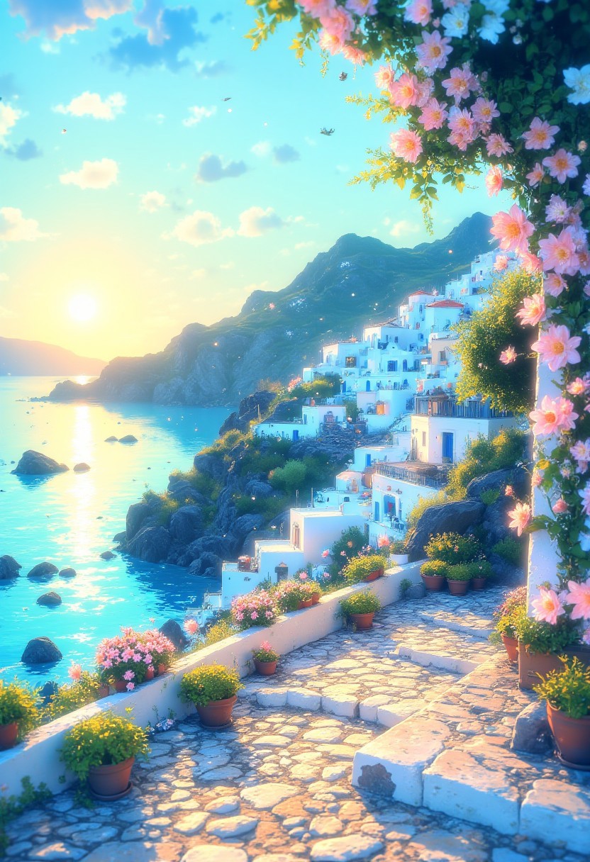 Greek Island Cliffside View "A stunning cliffside view on a Greek island, overlooking the shimmering turquoise waters of the Mediterranean. The whitewashed houses of a small village cascade down the rocky cliffs, with blue doors and windows adding a charming contrast. The foreground features a cobblestone terrace adorned with potted plants and climbing bougainvillea. The sun is setting, casting golden light over the sea and the surrounding landscape."