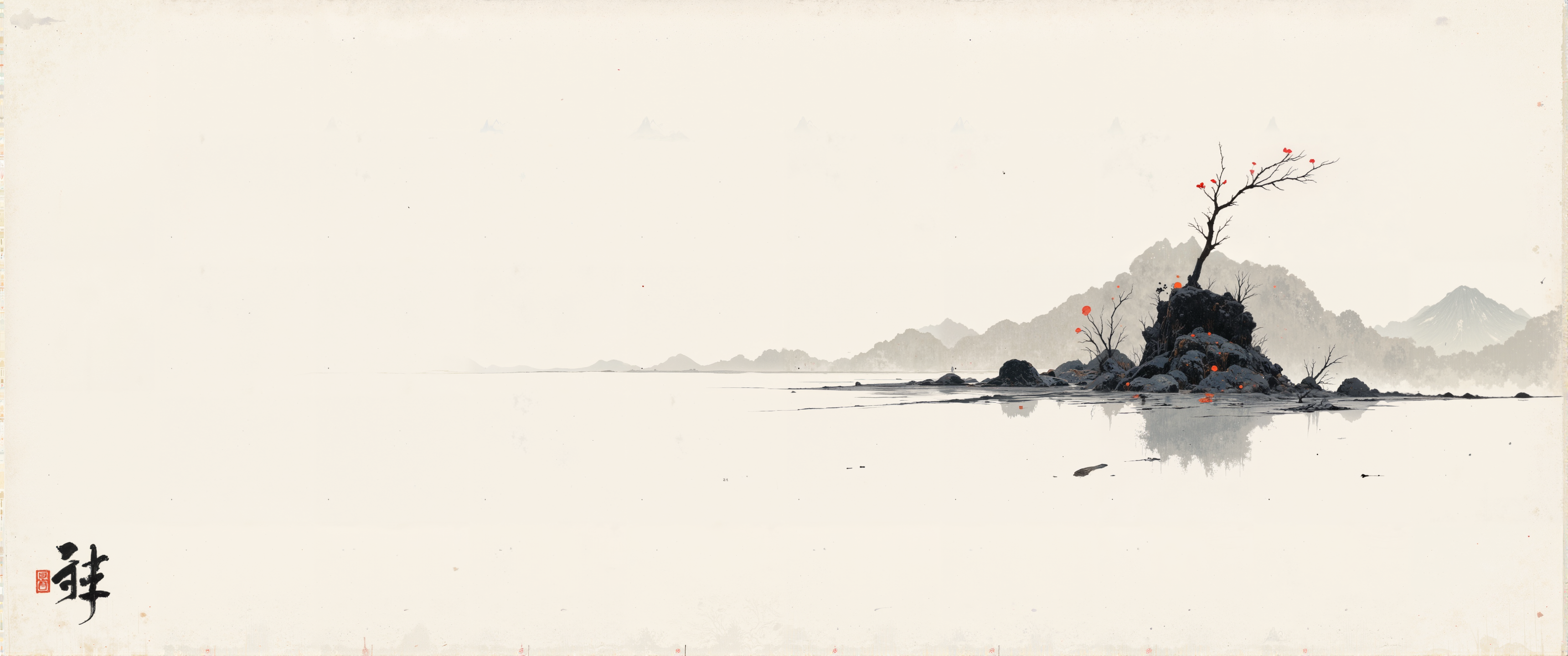 Zen calligraphy, single black brushstroke symbolizing emptiness on textured washi paper, elegant minimalist composition, intentional negative space embodying 'ma' concept, faint mountain silhouette barely visible in background, traditional sumi-e technique with varying ink intensity, contemplative atmosphere, droplets of water merging with ink representing impermanence, subtle sakura petal shadow in corner, masterful balance of presence and absence, wabi-sabi aesthetic celebrating asymmetry and natural imperfection, traditional seal mark in vermillion, faded gray tones creating depth, ethereal quality inviting inner stillness, refined artistic execution, meditative simplicity, profound quietude captured in monochromatic expression, timeless artistry, spiritual resonance, tranquil essence of Zen philosophy <lora:RM_Artistify_v1.0M:0.5> <lora:It's a LoRA for portraits, BUT! actually specialized in backgrounds. v1.0:0.2> <lora:Sinfully_Stylish_1.0_Flux:0.4> <lora:Fancha_style_v.5:0.8> <lora:flux_dev:1>