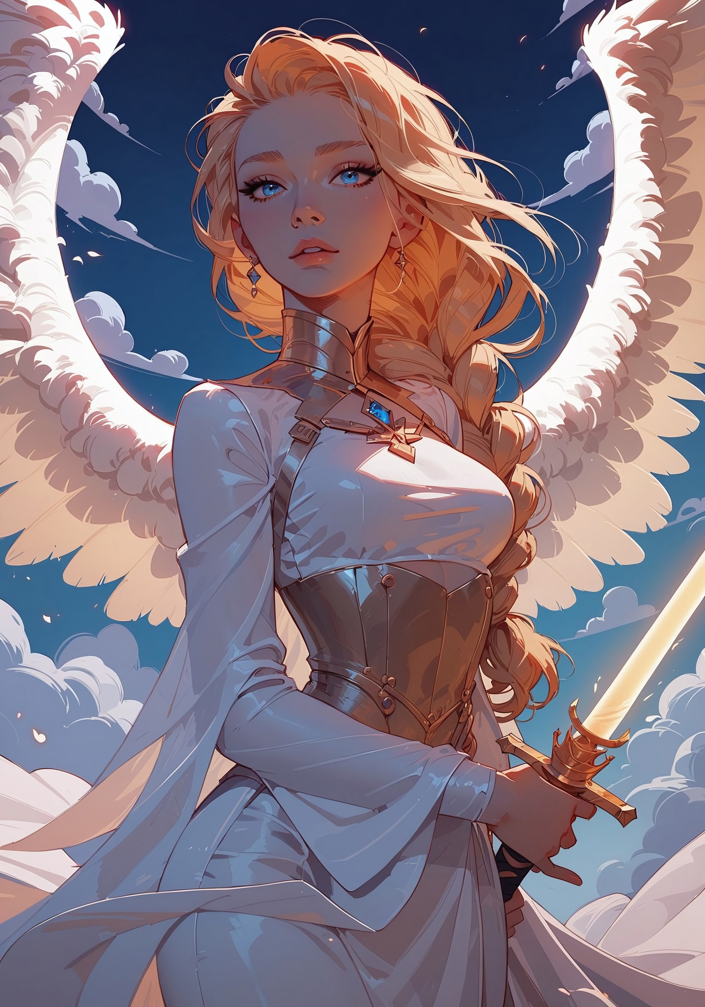 safe_pos, Masterpiece, core_9, score_8_up, score_7_up, score_6_up, Expressiveh, 1girl, pale skin, blue eyes, long blonde braided hair, beautiful face, hourglass figure, medium breasts, slender waist, big hips, transparent white robes, angel wings, holding flaming sword, eye contact, cloud background