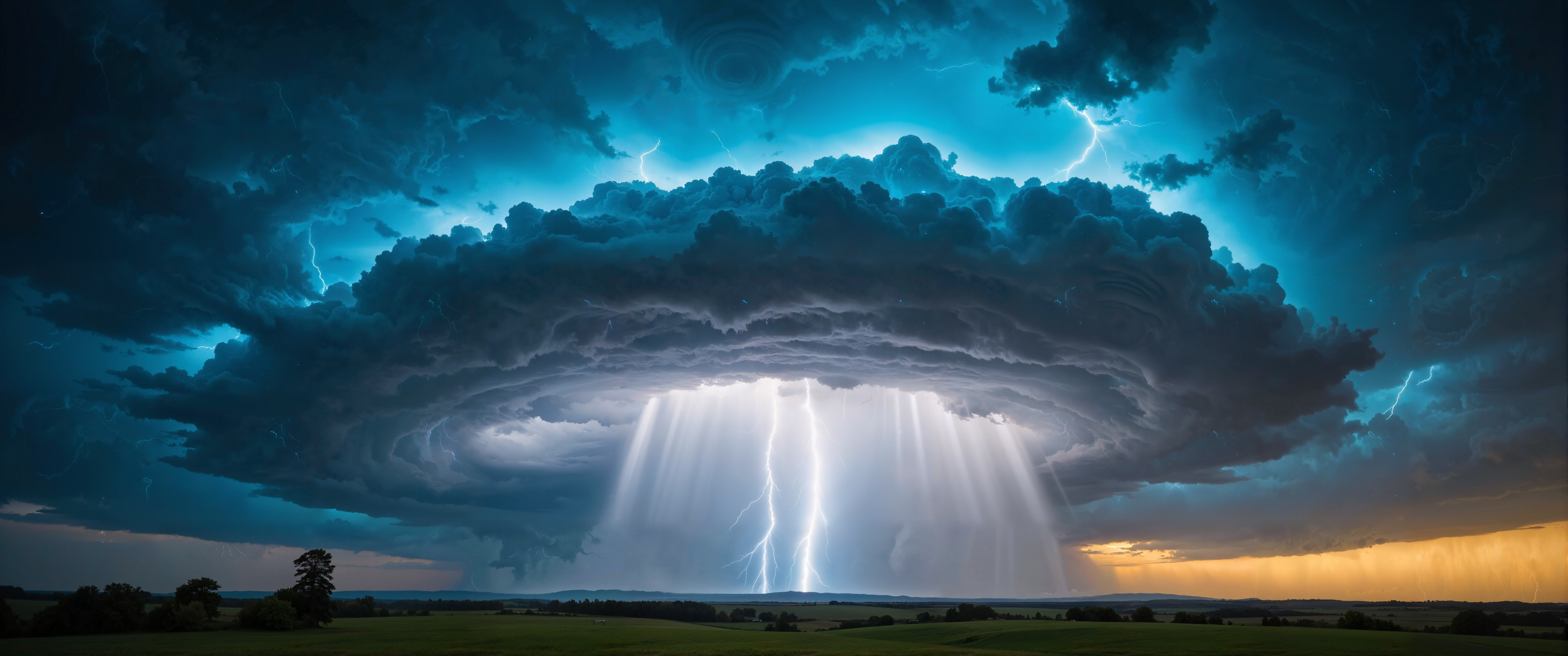 Majestic thunderstorm supercell illuminated by electric blue lightning cascading through spiral cloud formations, mammatus clouds hanging beneath churning anvil top, dramatic shelf cloud advancing with ominous green-tinged underbelly, golden-hour sunlight piercing storm's edge creating stark contrast, rain curtains visible in distance, tornado-like vortex developing at cloud base, multiple lightning strikes branching across turbulent sky, illuminating surrounding countryside, intricate cloud texture with defined layers and striations, dynamic energy captured in frozen moment, hyper-detailed atmospheric phenomenon, volumetric light interplay, photorealistic rendering, breathtaking composition, imposing scale, 8K resolution, masterpiece quality, cinematic atmosphere, raw elemental power <lora:flux_hyperkraximalism-balanced:0.3> <lora:Bruce Holwerda:0.7> <lora:Anime realistic V1:0.6> <lora:飿 ¼å-è¶ ç°å®:0.4> <lora:ck-painterly-fantasy-000017:0.2> <lora:flux_dev:1>