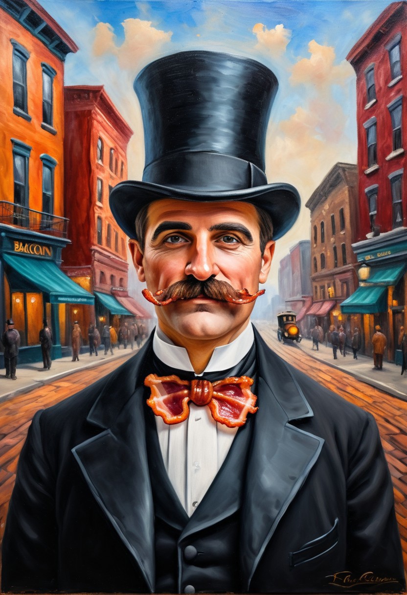 A man with a mustache made of bacon, He has a top hat and suite, dapper, old time city background, vibrant, Oil painting, high quality, detailed, realistic
