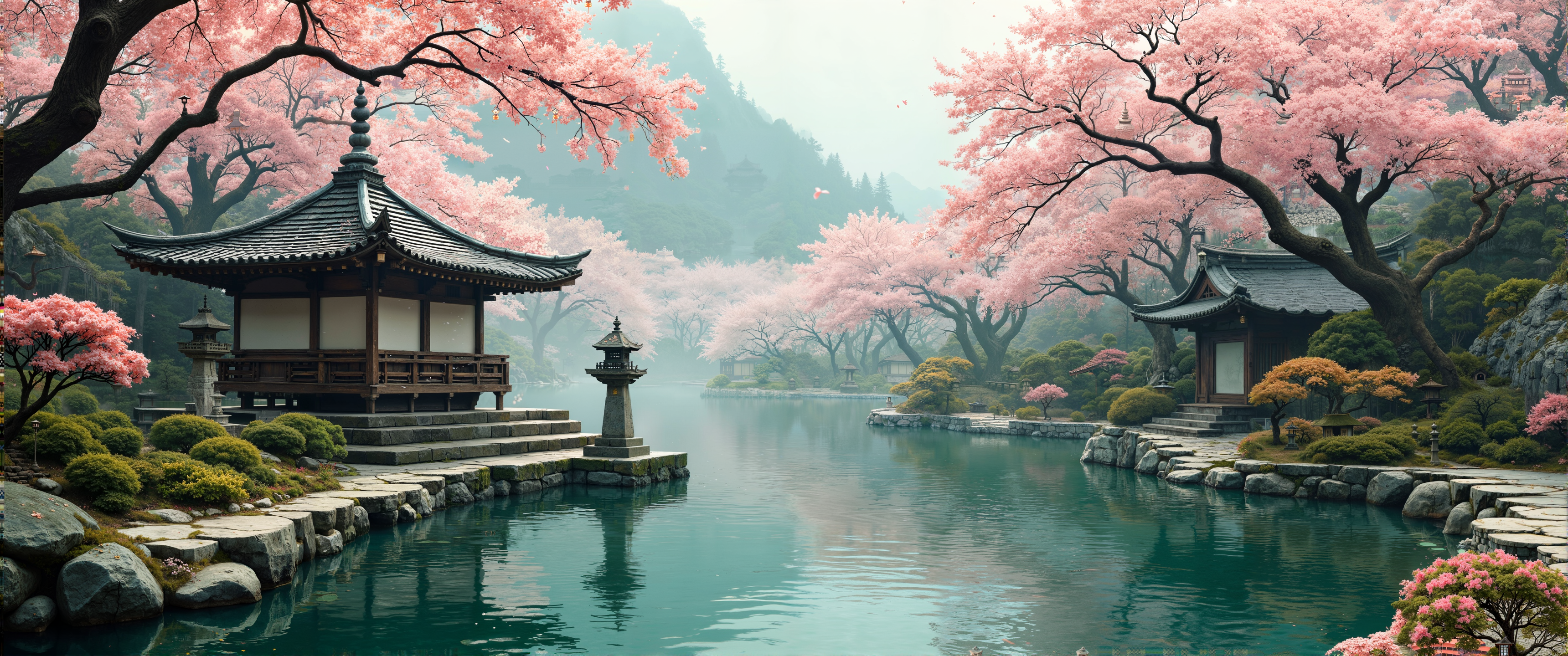 Ancient stone lanterns nestled among cascading ivory cherry blossoms in a secluded mountain temple garden, surrounded by centuries-old pines with twisted trunks. Weathered wooden pavilion perched on the edge of a serene emerald reflecting pool, capturing the ephemeral beauty of falling petals on rippling water. Delicate morning mist embraces the scene in soft ethereal light, enhancing the yugen aesthetic of profound mystery. Traditional nihonga composition with meticulous gold leaf accents highlighting dew-kissed moss gardens, perfectly balanced asymmetry and negative space. Stone pathway winding through azalea shrubs leads to a modest tea house with rice paper screens, embodying wabi-sabi appreciation of imperfection. Masterful brushwork capturing the transient moment between seasons, rendered in soft pastel hues with touches of vibrant spring colors. <lora:Illustration concept V1:0.1> <lora:Anime v1.3:0.3> <lora:flux_dev:1>