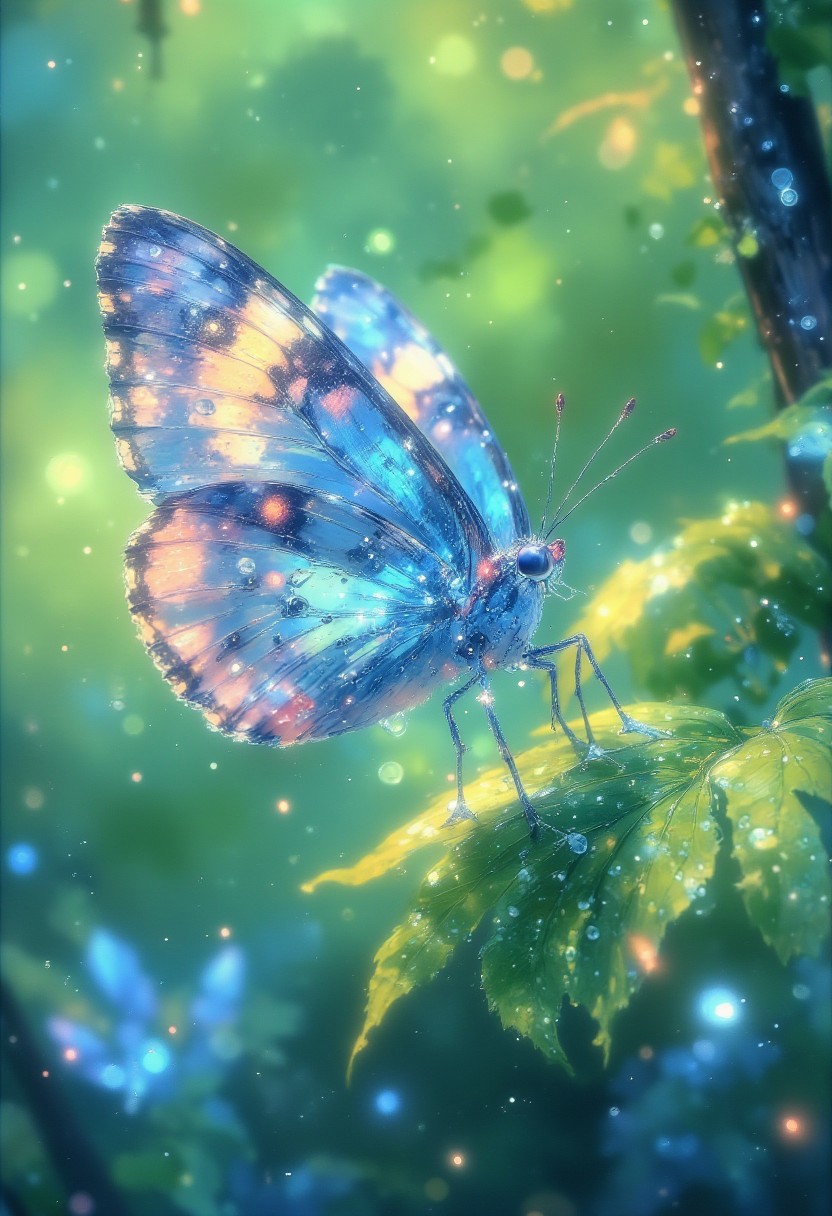 Dew-Kissed Butterfly Wings "A close-up macro shot of a butterfly resting on a leaf, its delicate wings adorned with tiny dew droplets that glisten in the soft morning light. The intricate patterns and iridescent colors of the wings are captured in stunning detail, with a blurred green background creating a dreamy atmosphere."