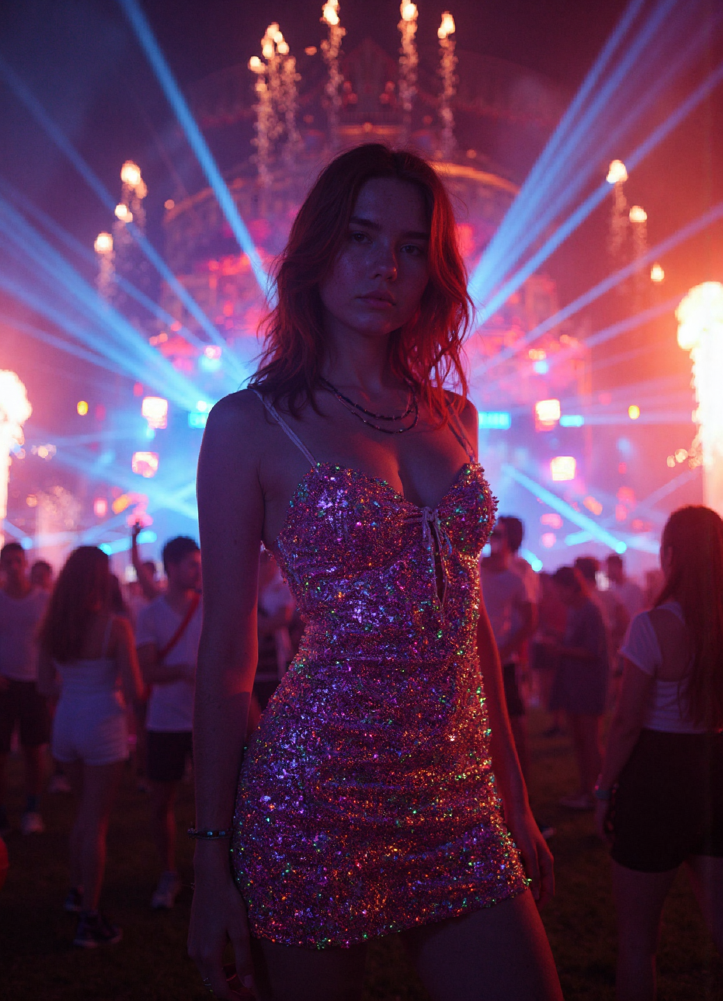 analog film photo A full-body shot of an extraordinary woman standing confidently facing the camera under the vibrant glow of an outdoor rave environment. She wears a stunning neon bioluminescent glowing cocktail dress, crafted with sequins that shimmer and catch the light of the surrounding stage effects. The location is electric, filled with colorful neon stage lights, pulsating laser beams crisscrossing the space, and bursts of fireworks and colorful flames illuminating the night sky. The atmosphere is alive with energy, as vibrant pyrotechnics and glowing stage equipment like massive speakers frame the scene. The camera captures her from a slight upward angle, emphasizing her presence while incorporating the dynamic backdrop. The depth of field focuses sharply on her form, with the vivid rave elements softly blurred in the background for artistic effect. The lighting creates a mesmerizing interplay between her dress and the neon glow, casting highlights and shadows that define her curves. The overall composition is balanced, blending the womanâs elegance with the chaotic energy of the rave setting, resulting in a visually stunning and harmonious image. Photorealistic details, high resolution, 8k ultra-detailed, professional photography, vibrant colors, dynamic lighting, sharp focus, natural depth of field, intricate textures, artistic . faded film, desaturated, 35mm photo, grainy, vignette, vintage, Kodachrome, Lomography, stained, highly detailed, found footage