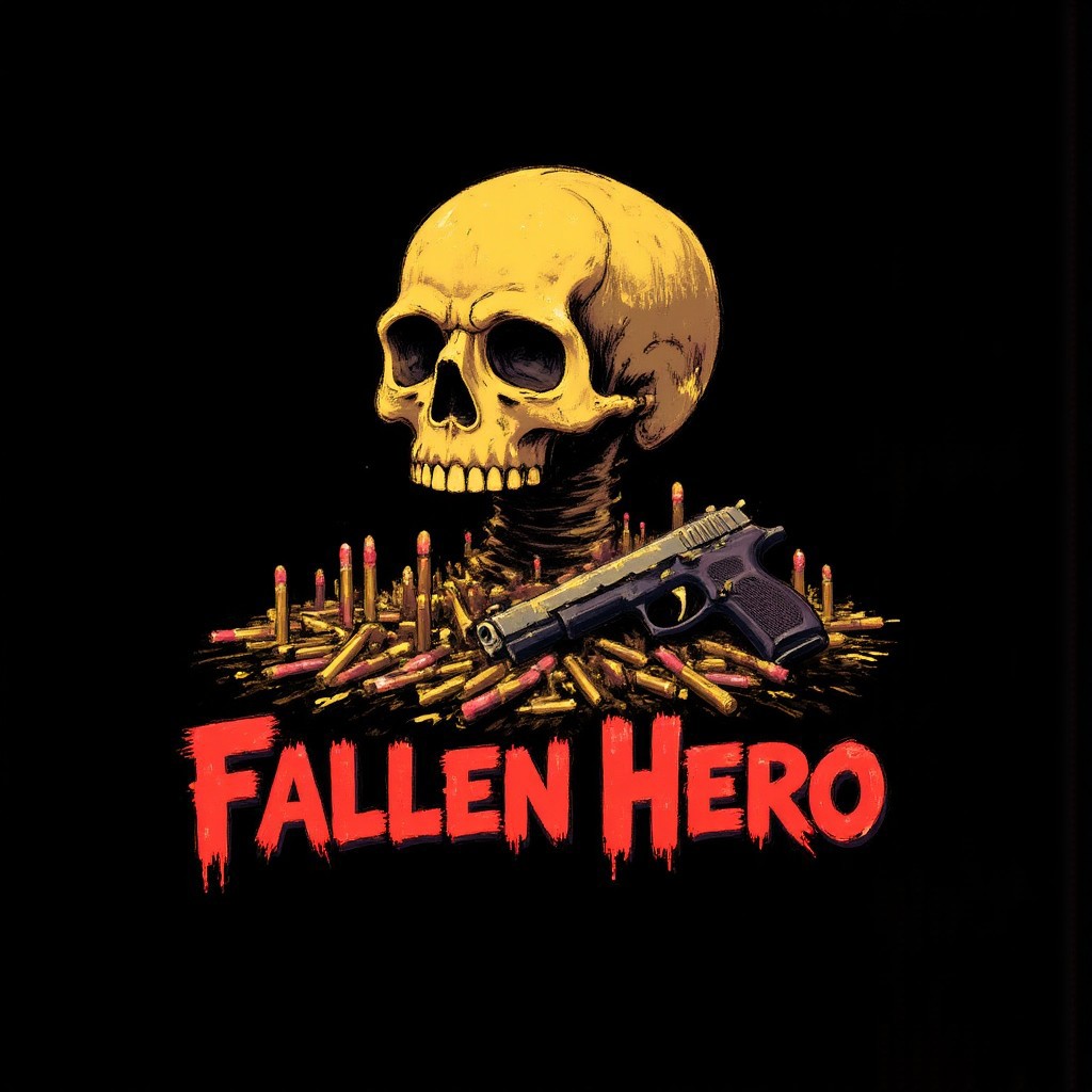 (Shirt Design), 4k quality, vibrant digital artwork, detailed design A graffiti art logo of a golden skull with a modern pistol next to the skull. The skull sits on top of a large pile of bullets. The text "Fallen Hero" in red text underneath. Black background