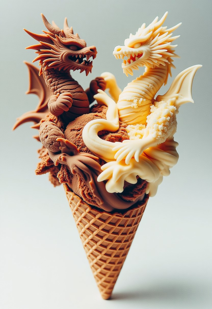 An elaborate ice cream figure sculpted into two dragons fighting, one chocolate and the other vanilla. The fine details of their faces and upper bodies flow into a swirl where their lower bodies circle each other. The mix of ice cream flows into a waffle cone. <lora:ice-cream-cone-flux:1>