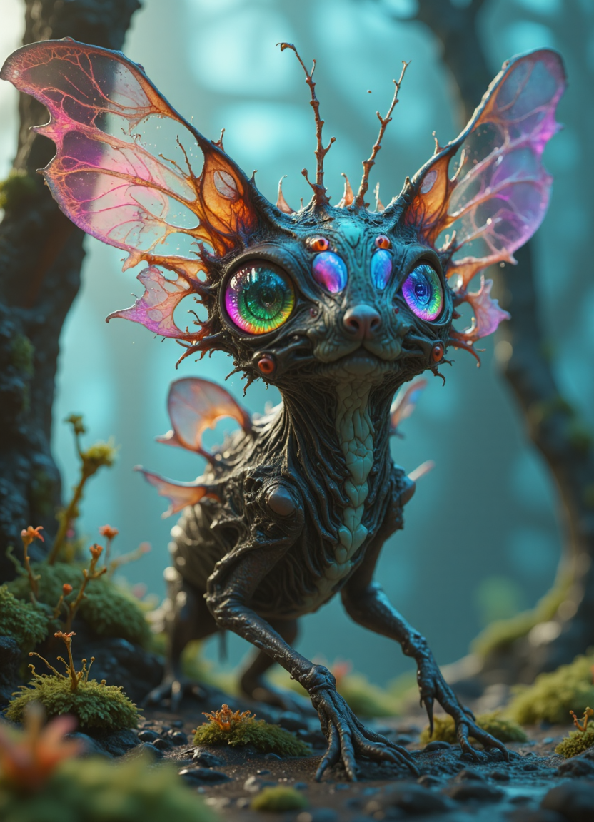 cinematic film still Location: Futuristic forest with neon lights, colorful smoke, moss hyper-realistic anthropomorphic creature that combines features of a cat, bat, and fly. The creature should have the sleek fur and expressive eyes of a cat, with large, membranous bat wings extending gracefully from its back. Its body should be agile and feline, while its head features delicate, multifaceted fly eyes that shimmer with iridescence. The creature should be posed in a dynamic stance, showcasing its wings partially spread, ready to take flight. The background should be softly blurred to emphasize the creature's intricate details, including the texture of its fur and the translucent quality of its wings, creating a captivating and surreal atmosphere, w31rd13sfl1, b10t4c34an, iridescent exoskeleton, . shallow depth of field, vignette, highly detailed, high budget, bokeh, cinemascope, moody, epic, gorgeous, film grain, grainy