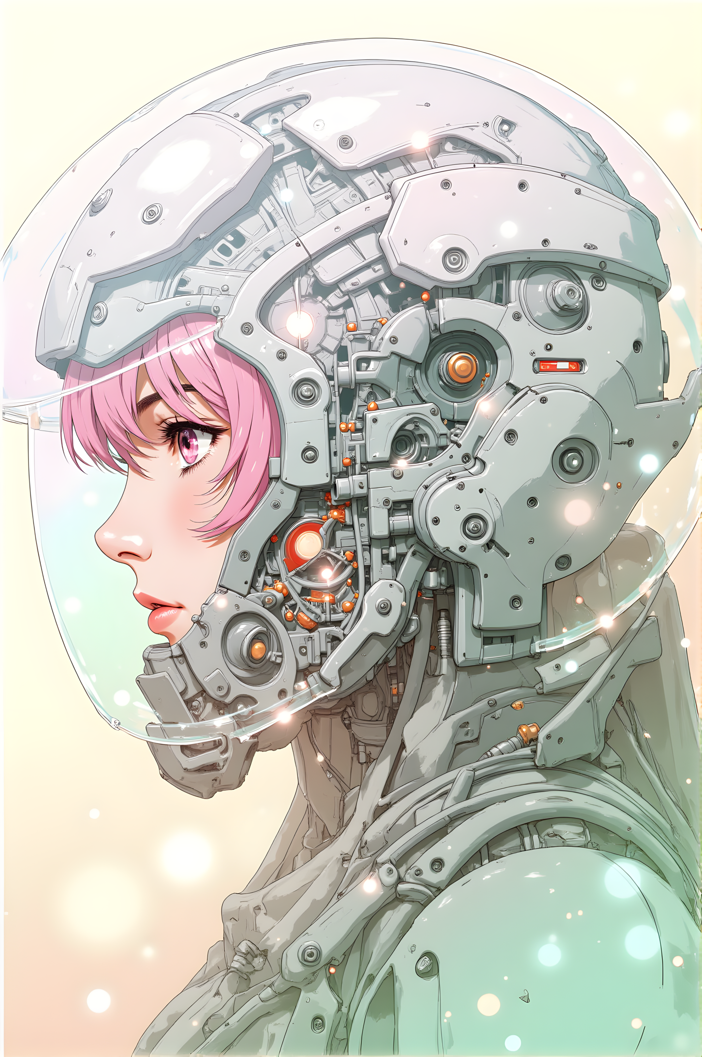 an anime-style character with pink hair is depicted from the side her head is encased in a futuristic helmet that reveals intricate mechanical components inside her skull these components include gears wires and other cybernetic elements suggesting advanced technology or artificial intelligence integration the helmet has a clear visor through which the mechanical parts are visible the background is a soft gradient of light colors adding to the ethereal and high-tech atmosphere of the image j_art, anime, anime art, <lora:FLUX\jul\J_Anime:1.0>, <lora:FLUX\Anime Art V3:0.1>, <lora:FLUX\RM_Artistify_v1.0M:0.1>, <lora:FLUX\RetroAnimeS1.1:0.1>