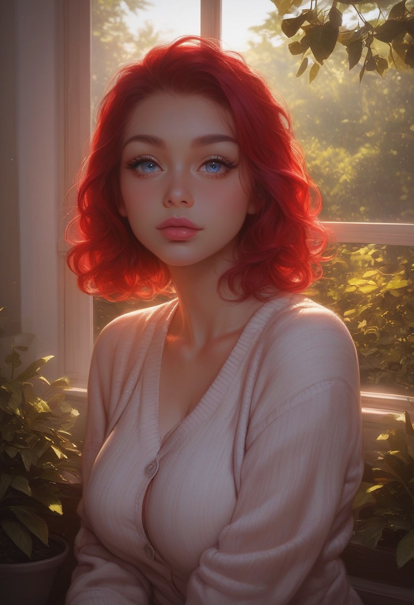 Score_9, Score_8_up, Score_7_up, (((High Resolution, Best Quality, Sharp focus))), dominating aroused woman, cute eyes gazing upon you with arousal, At a cafe, next to window, evening sunlight on her skin, sultry soft skin, comfortable clothes, loose open cardigan, Parted bob, Red hair, Dark blue eyes, Detailed iris with love, natural light, Detailed cafe, Plants placed inside the cafe, Breasts focus, Face focus, Glossy pink lips
