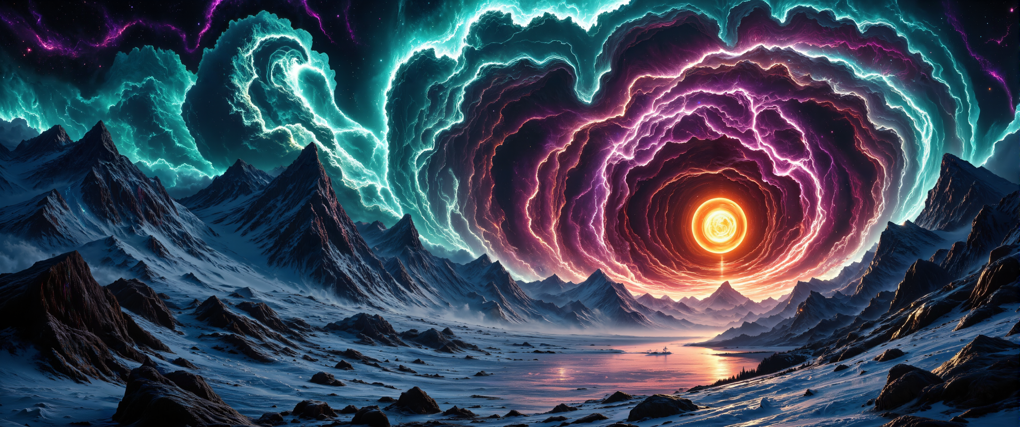 Spectacular cosmic tsunami, massive waves of ionized plasma and charged particles cascading through the upper atmosphere, creating a breathtaking undulating display of neon teal, electric magenta, and phosphorescent gold. Swirling solar winds collide with Earth's magnetosphere, generating hypnotic fluid dynamics and ethereal ripple patterns that stretch across the horizon. Intricate magnetic field lines materialize as luminous threads weaving through the night sky. Immense energy vortices spiral downward toward snow-capped mountains silhouetted against the radiant phenomenon. Crystalline ice particles in the atmosphere refract and amplify the celestial light show, adding diamond-like sparkles throughout. Masterful interplay of light and shadow, depth and movement, captured in 8K ultra-high definition, photorealistic clarity with stunning contrast. Atmospheric perspective shows immense scale, atmospheric drama, and the raw power of interstellar forces colliding with our world. <lora:flux_floralizer:0.6> <lora:New_Fantasy_CoreV4_FLUX:0.7> <lora:DND_GRAINYBOYZ_FG_FLUX_V2_ROMULUS_Lora:0.5> <lora:boFLUX Double Exposure Magic v2:0.7> <lora:flux_dev:1>