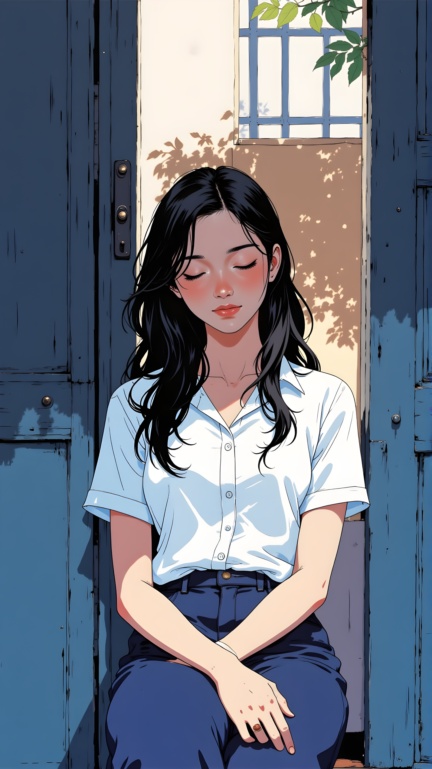 Beautifully detailed and serene illustration of a person sitting in front of a door. The individual has long, dark hair that falls over their shoulders, adding to the overall sense of movement and texture. They are wearing a light blue shirt with short sleeves, which creates a sense of casual elegance. The person's expression is calm and peaceful, with their eyes closed and a slight smile on their lips, suggesting a moment of quiet reflection or relaxation. Their posture is relaxed, with their hands resting on their lap, creating a sense of ease and comfort. The background features a wooden door with a small window, which allows some natural light to filter into the scene. The lighting in the image is soft and diffused, highlighting the texture of the person's clothing and the details of their hair. Overall, this illustration captures a moment of quiet beauty and tranquility, with the combination of the person's attire, the soft lighting, and the detailed rendering creating a visually engaging and emotionally resonant scene. The use of color and composition adds depth and character to the artwork, making it a powerful and evocative piece. j_art, anime, anime art, <lora:FLUX\jul\J_Anime:1.0>, <lora:FLUX\Anime Art V3:0.1>, <lora:FLUX\RM_Artistify_v1.0M:0.1>, <lora:FLUX\RetroAnimeS1.1:0.1>
