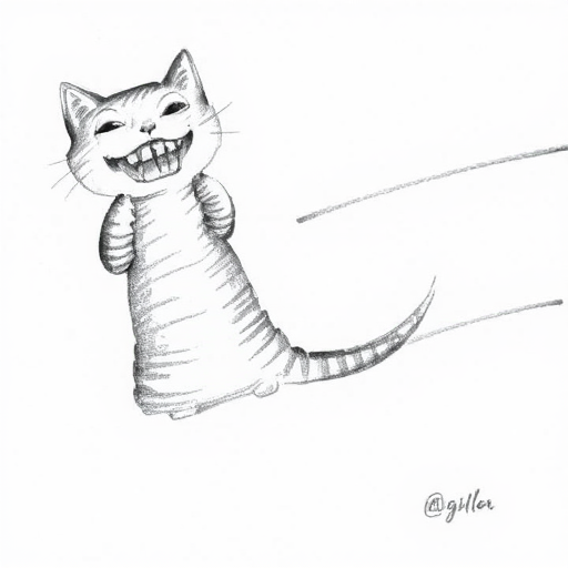 A pencil sketch with bold strokes. A fugglers cat playing in the living room, white background.