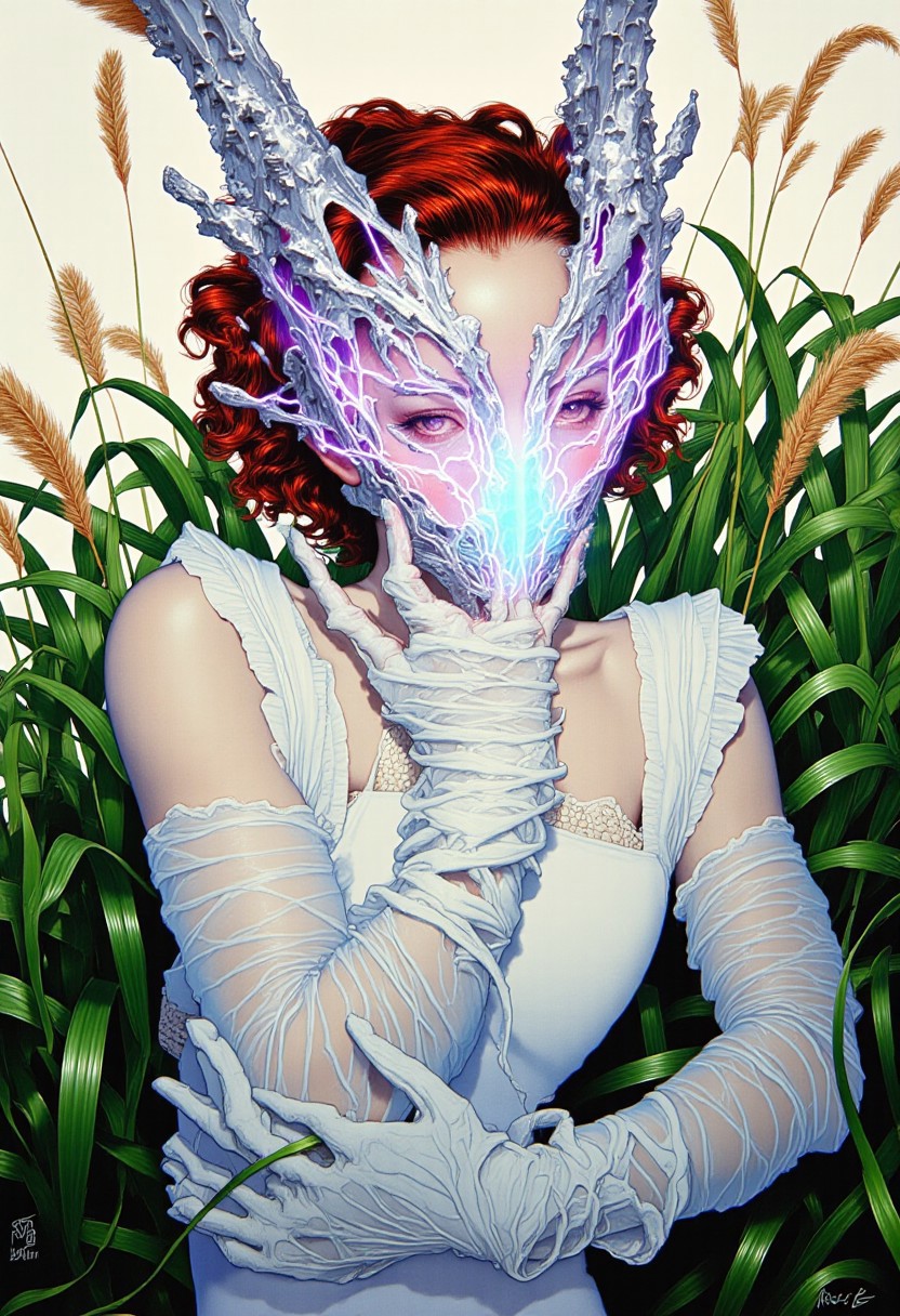 A high-resolution ArsMJStyle, colored pencil hyper-detailed realism featuring a woman standing amidst lush greenery, surrounded by tall grasses and wild plants, her wavy auburn hair cascading in luminous waves. She wears an avant-garde ensemble of sheer, layered fabrics that drape fluidly over her form, exuding ethereal elegance with a futuristic edge. Her face is concealed by an extreme avant-garde mask, a mesmerizing fusion of organic and digital aesthetics. The mask is an elaborate structure of interwoven metallic filaments, iridescent crystal shards, and bioluminescent fractal patterns, forming a living, shifting lattice of glowing violet and white. Microfiber tendrils extend from its surface, pulsating with soft electric currents, while delicate, spectral feathers infused with liquid light drift from the edges, as if reacting to unseen forces. The mask’s asymmetrical, sculptural form partially veils her features while leaving glimpses of her intense gaze through intricate negative space. She poses with poised intensity, hands positioned in a dynamic, fluid motion, while the soft, diffused daylight filters through the dense greenery, casting natural highlights on her translucent attire. Tall grasses with golden-brown tassels sway gently around her, creating a striking contrast between the organic environment and her glowing, futuristic presence. The interplay of light and shadow accentuates the surreal textures of her mask and garments, blending mystique, grace, and futuristic allure into a moment of otherworldly serenity.