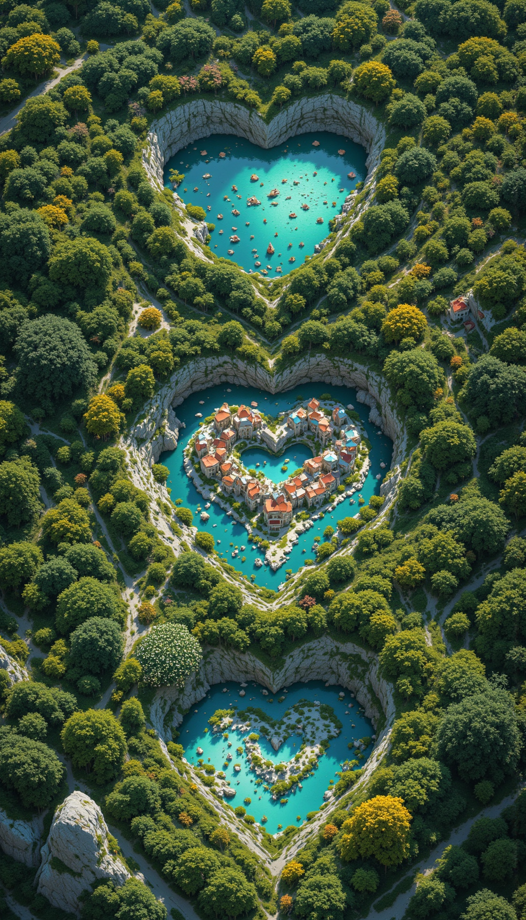 pinkfluxproultrafantasia, aidmaimageupgrader Create a cinematic, ultra-detailed 4K image of heart-shaped nature scenes. The first scene features a single heart surrounded by crystal-clear water, with a quaint village inside the heart, nestled amidst vibrant greenery and colorful flowers. The second scene has two hearts surrounded by serene water, each heart containing a charming village with lush landscapes and blooming flora. The third scene showcases three hearts encircled by tranquil water, each heart housing a picturesque village, surrounded by majestic trees, stunning flowers, and breathtaking natural beauty. Ensure each scene exudes a blissful and harmonious atmosphere, with the hearts seamlessly blending into the enchanting natural surroundings., ultra-detailed