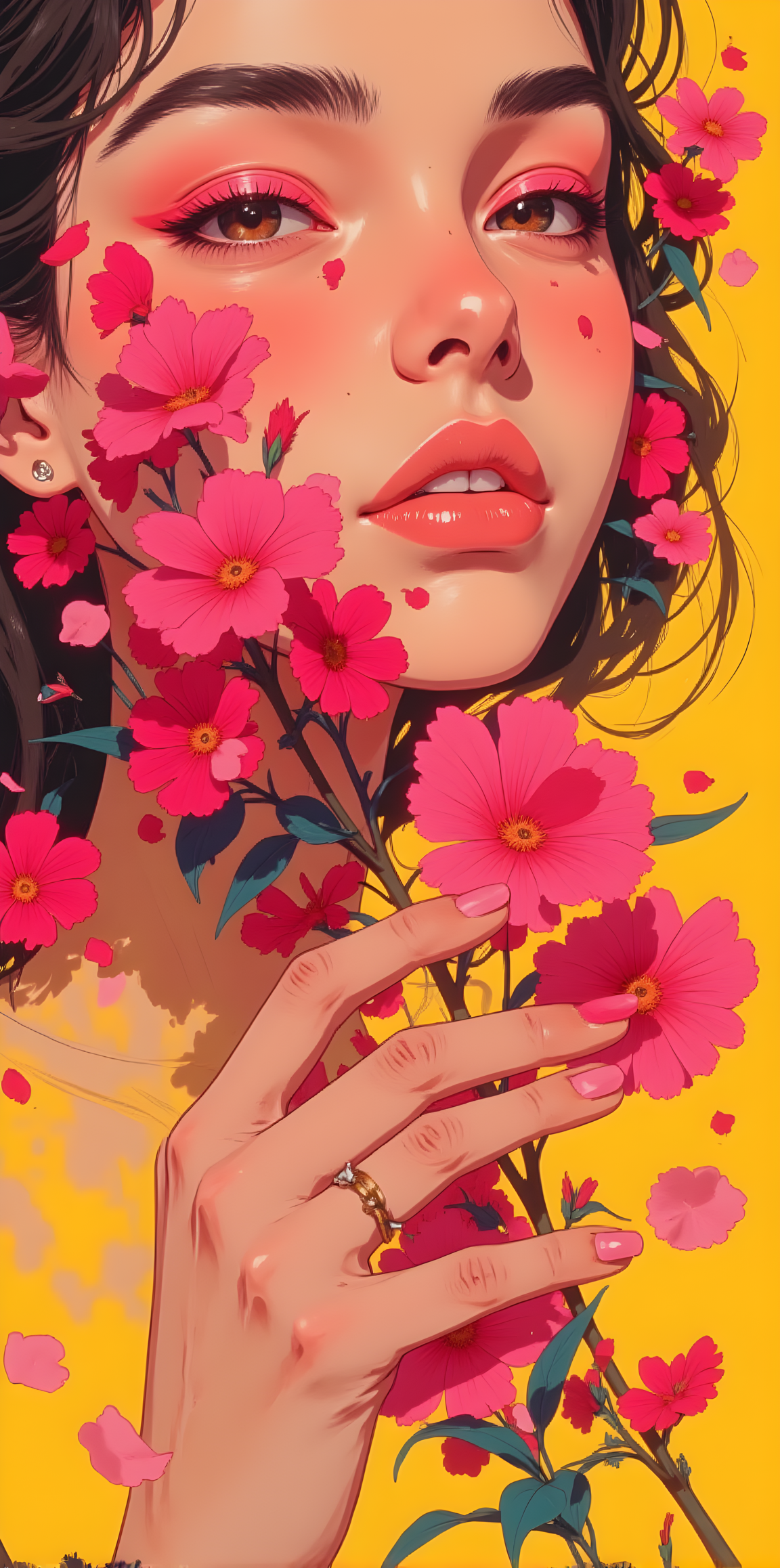 This image is a striking and vibrant illustration of a person with long, dark hair. The individual has large, expressive eyes that are accentuated by bright pink eyeshadow, which adds a sense of intensity and emotion to their gaze. Their lips are painted a soft pink color, which complements the overall color scheme of the image. The person's face is adorned with numerous pink flowers, which create a sense of natural beauty and harmony. The flowers are depicted in various shades of pink, with some petals falling around the person's face, adding to the dreamlike and otherworldly atmosphere of the scene. The background is a solid, warm yellow color, which helps to draw attention to the subject and enhances the overall mood of the image. The colors are rich and vibrant, creating a powerful visual impact and drawing the viewer's eye across the image. Overall, this illustration captures a moment of quiet beauty and intensity, with the combination of the person's attire, the dramatic lighting, and the thoughtful pose creating a visually engaging and emotionally resonant scene. The use of color and composition adds depth and character to the artwork, making it a powerful and evocative piece. j_art, anime, anime art, <lora:FLUX\jul\J_Anime:1.0>, <lora:FLUX\Anime Art V3:0.1>, <lora:FLUX\RM_Artistify_v1.0M:0.1>, <lora:FLUX\RetroAnimeS1.1:0.1>