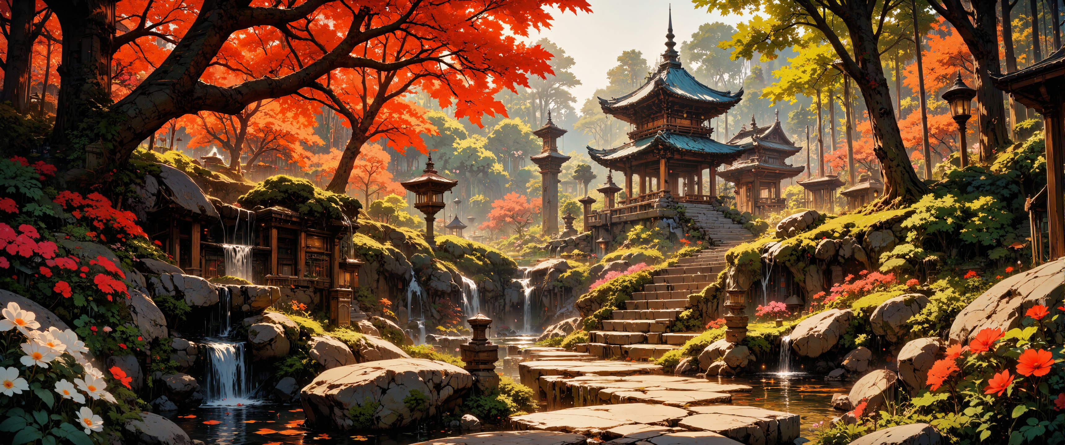 Ancient stone pathways meander through a verdant Japanese maple grove, their vibrant crimson and copper leaves catching golden afternoon sunlight. Weathered lanterns cast soft shadows across moss-covered boulders and miniature waterfalls that trickle into crystal-clear ponds dotted with water lilies. Delicate iris and bamboo groves frame the scene, creating natural divisions between meditation areas furnished with aged cedar benches. A solitary pagoda with patinated copper roofing stands partially concealed by weeping cherry trees, their pale pink blossoms occasionally drifting downward. The distant sound of wind chimes suggested by their subtle movement. Natural stone stairs ascend gentle terraces bordered by meticulously pruned azaleas in shades of salmon and ivory. Atmospheric mist hovers above reflective water surfaces, lending an ethereal quality to this tranquil sanctuary. Masterpiece, photorealistic, 8k detail, harmonious composition, contemplative atmosphere. <lora:Classic_Anime_Colors:0.6> <lora:Niji B:0.6> <lora:FluxMythG0thicL1nes:0.8> <lora:Anime realistic V2:0.4> <lora:reedy-art-style:0.3> <lora:flux_dev:1>