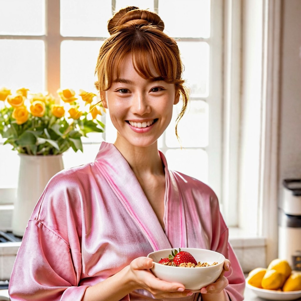 A cheerful young Japanese woman with light skin and ginger hair tied in a casual bun, standing in a warmly lit kitchen during golden hour. She wears a transparent pink silk kimono. Her expression is joyful as she holds a bowl of yogurt topped with fresh strawberries and granola, with a spoon resting inside. Sunlight streams through a window behind her, casting a soft golden glow on her face and surroundings. The kitchen is modern and cozy, featuring dark cabinets, a clean countertop, and a vase with yellow flowers near the sink. The atmosphere is warm and inviting, with realistic lighting and high detail.