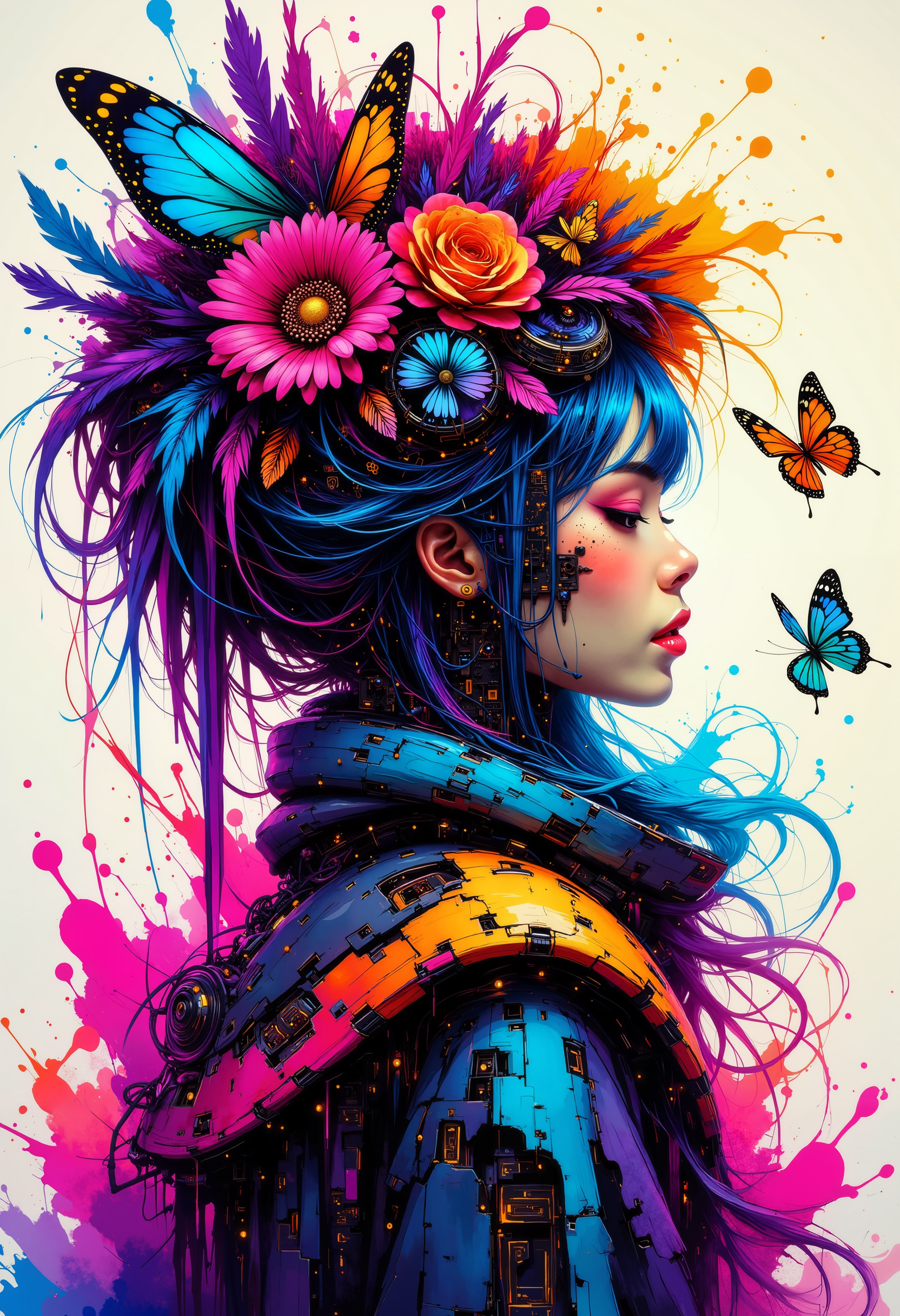 a fantastic abstract colorful art splash in the style of bo-cyborgsplash, a woman with an elaborate, colorful costume adorned with feathers and flowers, surrounded by butterflies<lora:boFLUX Cyborgsplash.safetensors:1.0:1.0>