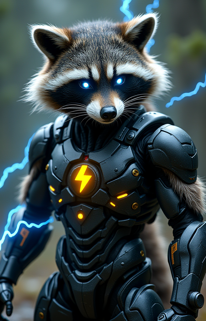 full body view, humanoid cyborg raccoon, wears mostly black colored cybernetic futuristic armor, yellow lightning symbol on center of the chest, spreading electric lightnings with hands, grey fur, blue cybernetic eyes, cinematic, photorealistic
