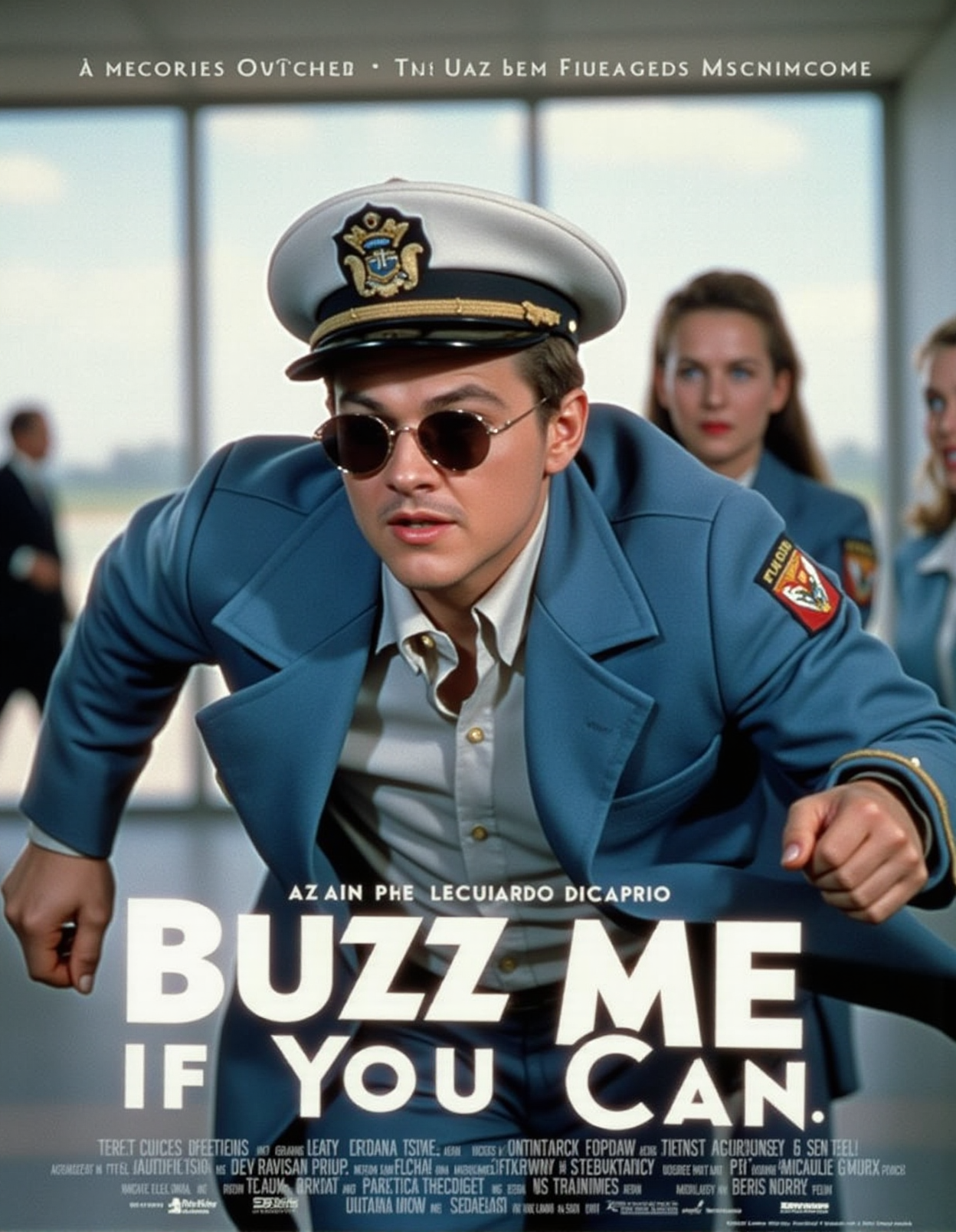 advertising poster style, movie poster with text "BUZZ ME IF YOU CAN". on the poster you can see a blonde young man looking like Leonardo DiCaprio in a blue pilot's uniform, a white pilot's cap and sunglasses in the style of the American 80s running away from a FBI-Agent in the airport. in the background you can see 2 stewardesses who look after him in surprise. (the text "BUZZ ME IF YOU CAN" is positioned in the lower half of the picture in the foreground:1.2), The setting is a movie poster. The typography uses bold, clear fonts for the title and subtitles. The lighting is even and bright. A text overlay describes the movie as a true story, and the color scheme is muted and consistent. The poster conveys a humorous tone, while also presenting a dramatic and slightly suspenseful mood, fitting for a film with an intriguing plot. <lora:technicolor:1>